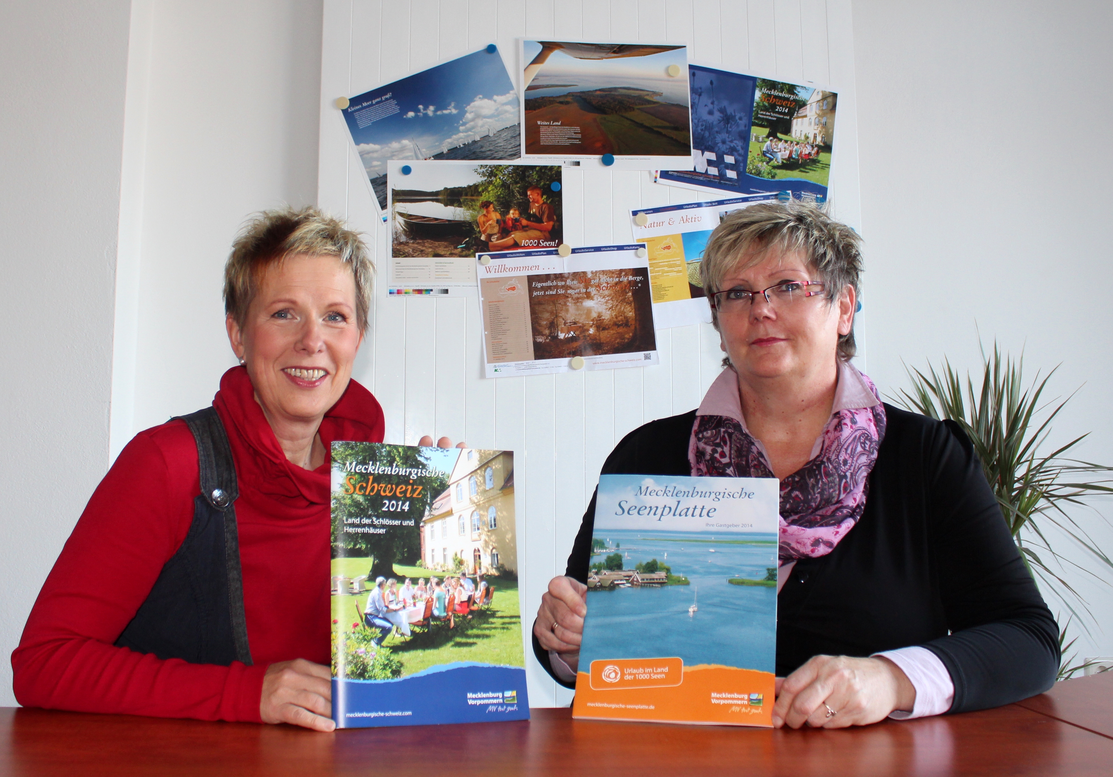 Die Mitarbeiterin des Tourismusverbandes Mecklenburgische Seenplatte, Marita Klemmer (rechts), und die Mitarbeiterin des Tourismusverbandes Mecklenburgische Schweiz e.V., Cornelia Nieswandt, präsentieren die neuen Urlaubsplaner