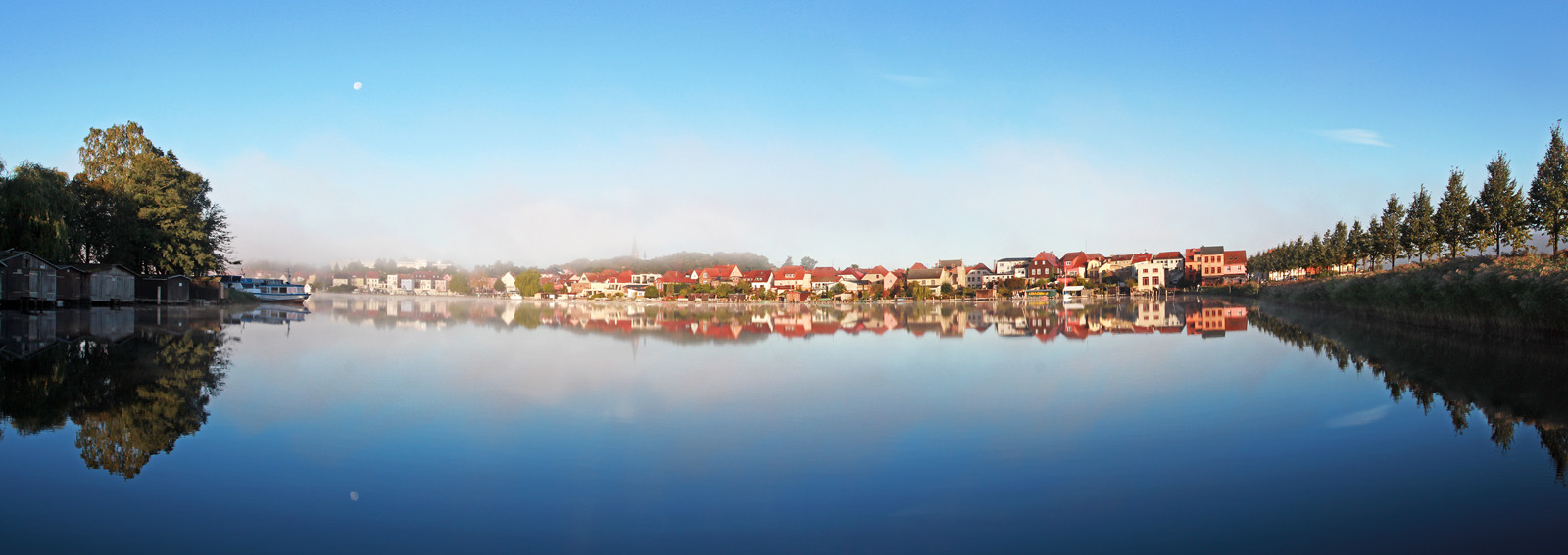 Malchower Panorama mit Blick auf die Insel und den Hafen im frühmorgendlichen seichten Nebel.