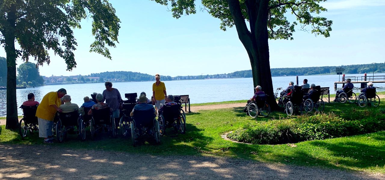 Es wird ja viel gesagt und geschrieben über die Pflege in Deutschland und das Personal. Wir haben heute ein sehr schönes Beispiel von liebevoller Pflege gesehen.Die Mitarbeiterinnen des DRK-Pflegeheimes am Warener Kietz scheuen trotz der vielen Arbeit, die sie tagtäglich haben, keine Mühe, um ihren Bewohner Abwechslung und wenigstens ein bisschen frische Luft zu verschaffen. Sie begleiten an warmen Tagen mehr als 20 Frauen und Männer – die meisten sind auf den Rollstuhl oder eine Gehhilfe angewiesen – in die Kietzanlagen. Dort verbringen sie – versorgt mit reichlich Trinken – eine angenehme Zeit mit buntem Treiben ringsherum bis zum Mittag, ehe es wieder zurück geht.