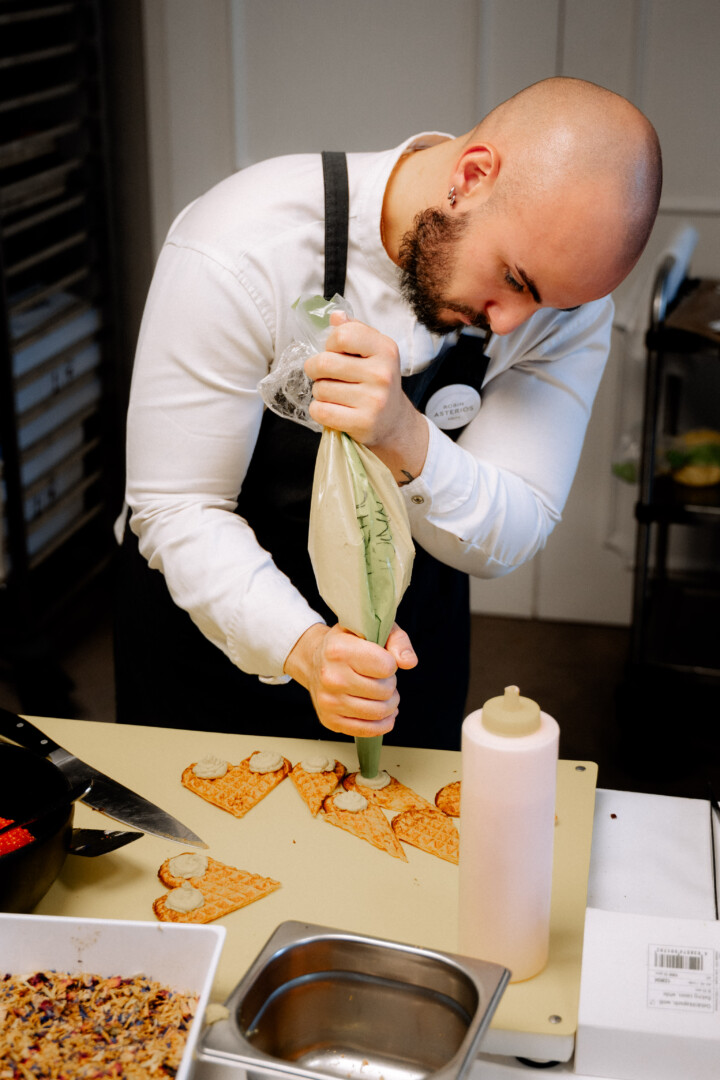 - Raz-el-Hanout-Süßkartoffelwaffel mit Pistazien-Hummus und Chili-Kaviar
