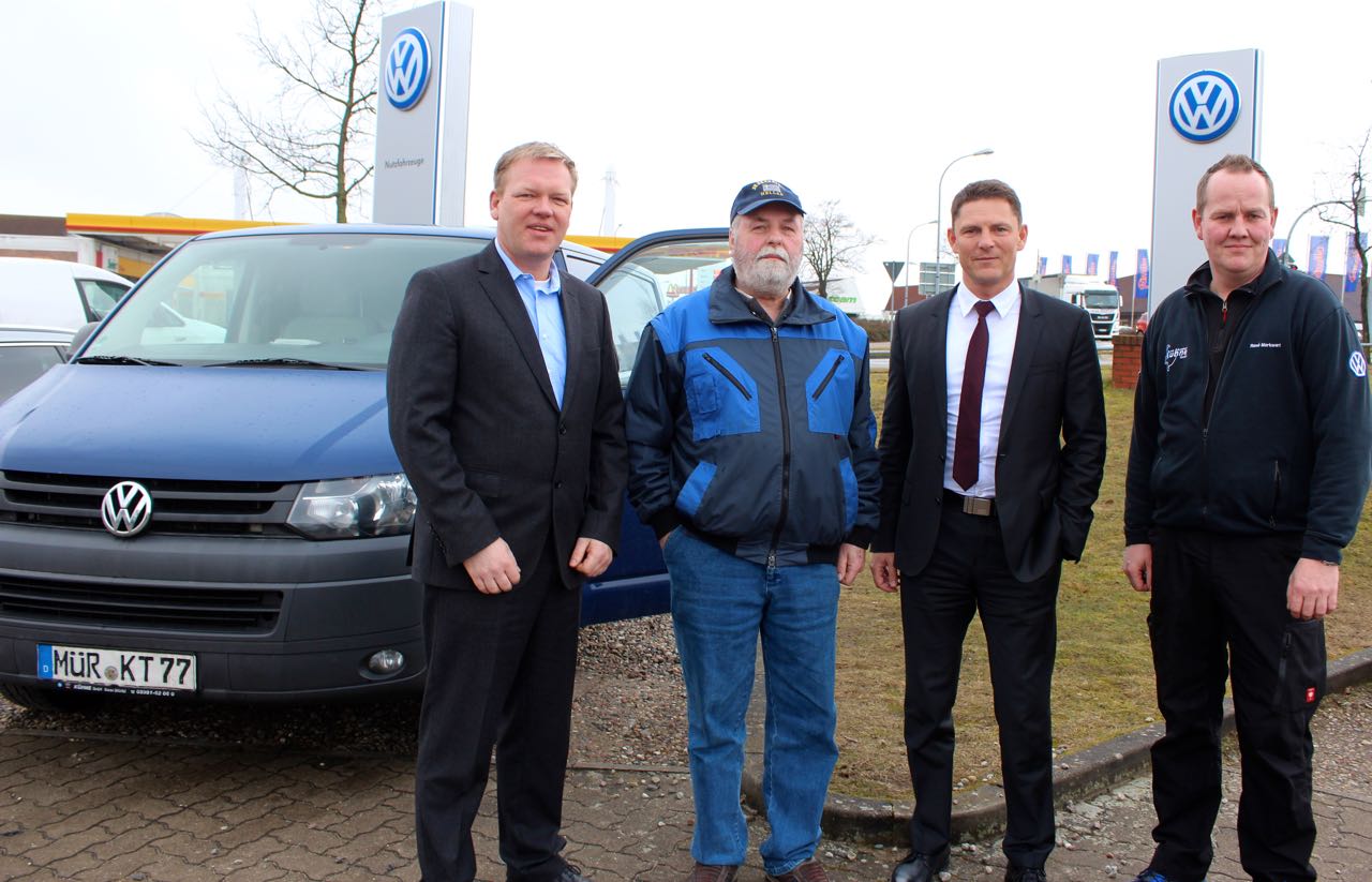 Foto unten: VW-Bezirksleiter Tobias Reinert, Kraftfahrer Norbert Rosenthal, Geschäftsführer Thomas Kühne und Kundendienstberater René Markwart vor dem „Million-Transporter“.