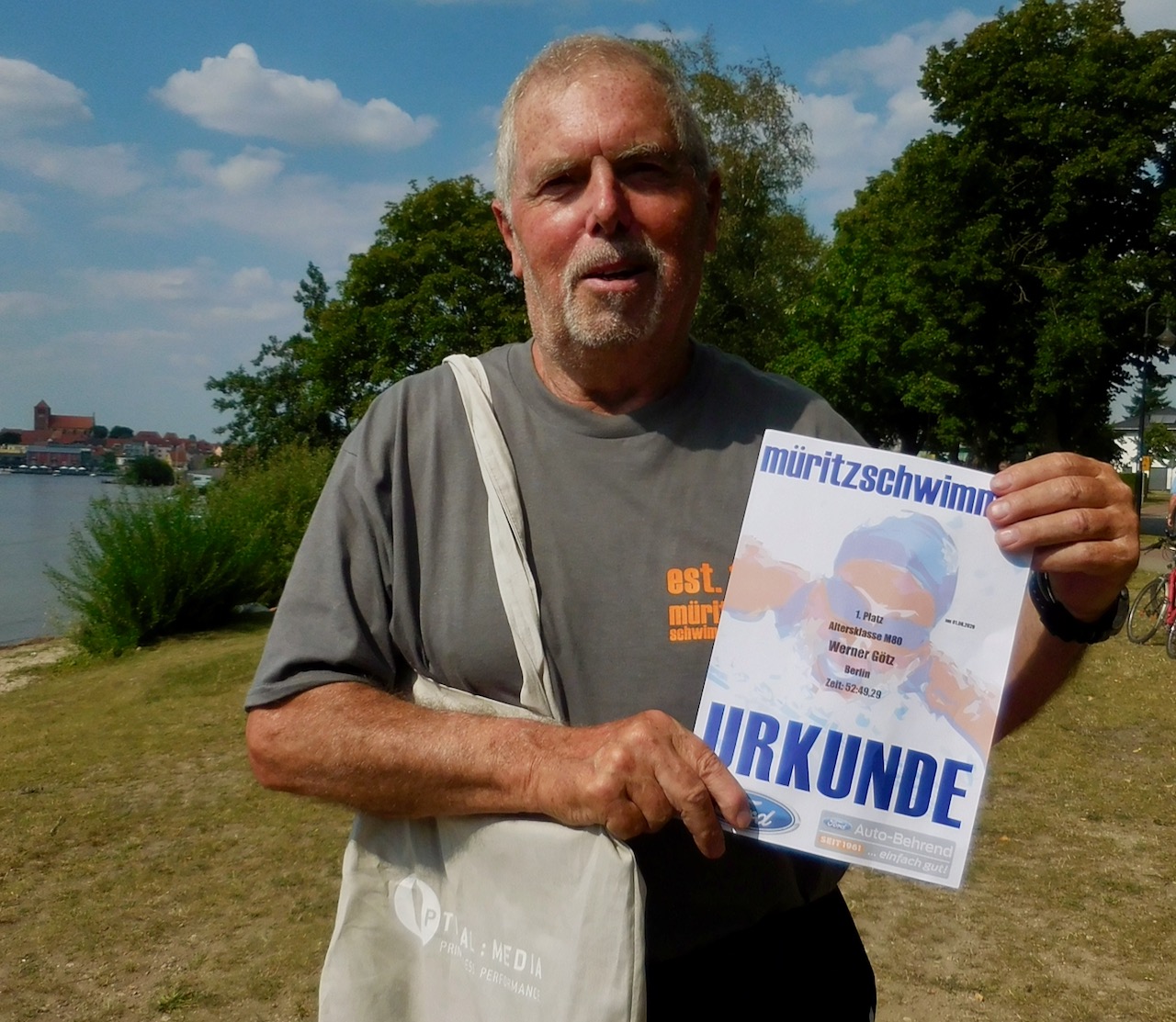 Beim diesjährigen Müritzschwimmen gab es weder Siegerehrungen noch Urkunden in die Hand. Das sahen die Corona-Vorschriften so vor. Die Teilnehmer konnten sich ihre Urkunden aber ausdrucken. Doch ausgerechnet der älteste Teilnehmer, der 80-jährige Werner Götz, blieb bislang ohne Urkunde, da er keinen Drucker besitzt. Für Karsten Hub vom Wassersportverein Müritz war klar – Hier müssen wir eine Ausnahme machen. Und so brachte er dem Rentner die Urkunde persönlich vorbei.
