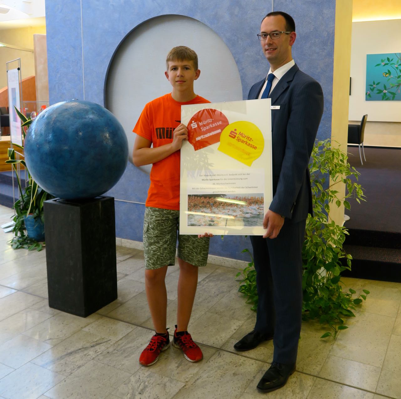 Foto unten: Der erfolgreiche Warener Schwimmer Paul Greiner hat heute die Badekappen fürs Müritzschwimmen von Christian Henning, Mitglied des Vorstandes der Müritz-Sparkasse, entgegen genommen. Paul hat übrigens in diesem Jahr die Startnummer 1.
