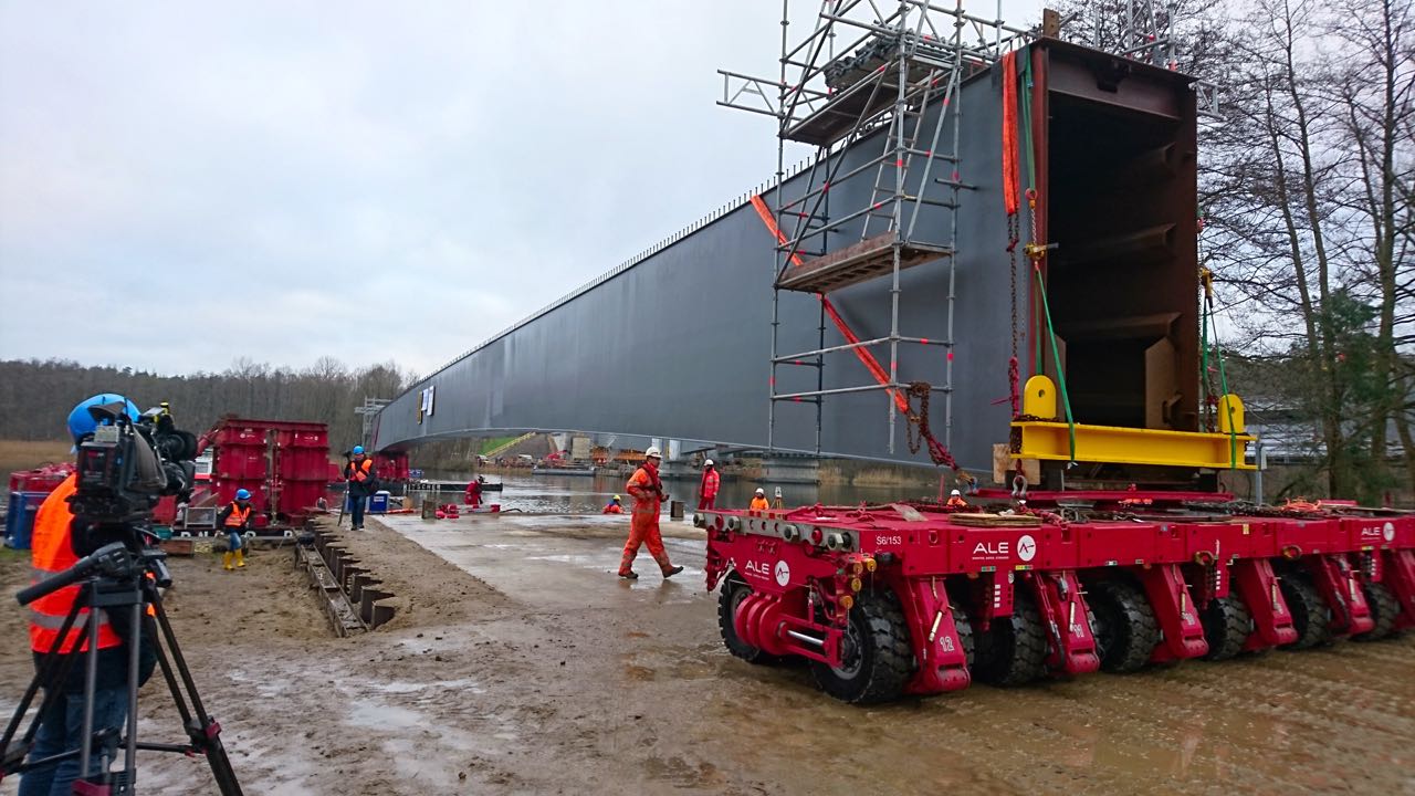 Spezialisten unter den Wasserbauern aus den Niederlanden bugsierten die erste beeindruckende Stahlkonstruktion am Dienstag über spezielle Fahrkonstruktionen mit zwölf Achsen auf Pontons. Von dort wurde der Träger zu den Brückenpfeilern geschippert. Dort wird der Träger an hydraulischen Hebern befestigt, so dass nichts mehr passieren kann.