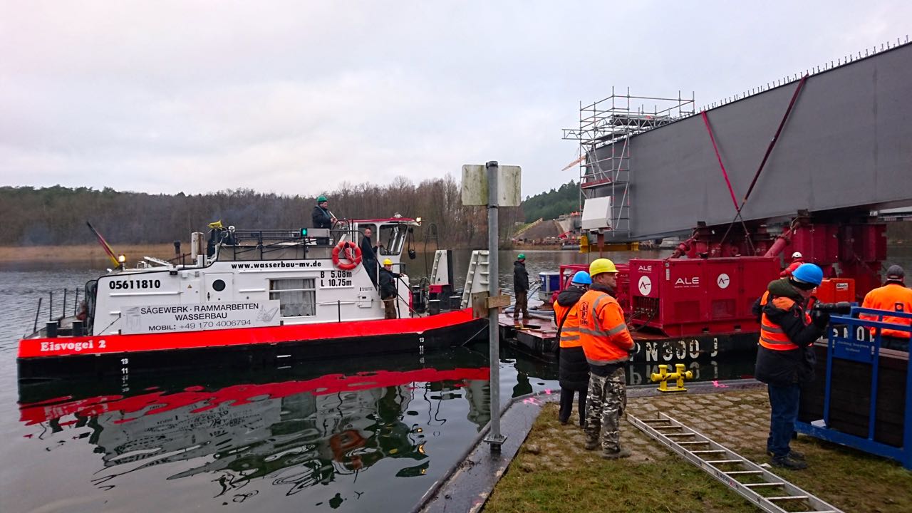 Spezialisten unter den Wasserbauern aus den Niederlanden bugsierten die erste beeindruckende Stahlkonstruktion am Dienstag über spezielle Fahrkonstruktionen mit zwölf Achsen auf Pontons. Von dort wurde der Träger zu den Brückenpfeilern geschippert. Dort wird der Träger an hydraulischen Hebern befestigt, so dass nichts mehr passieren kann.
