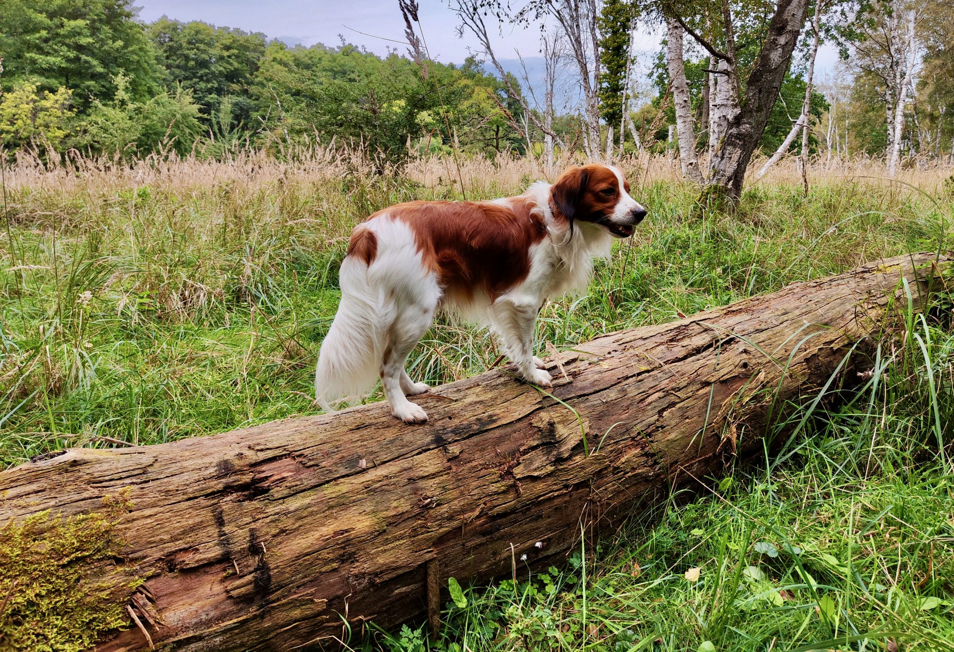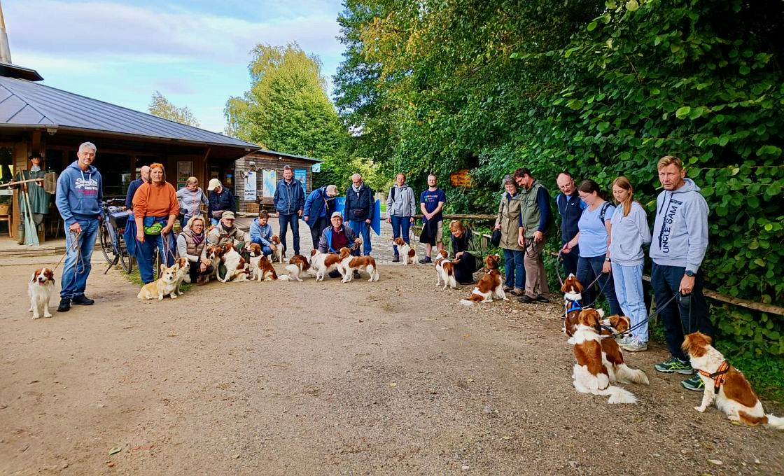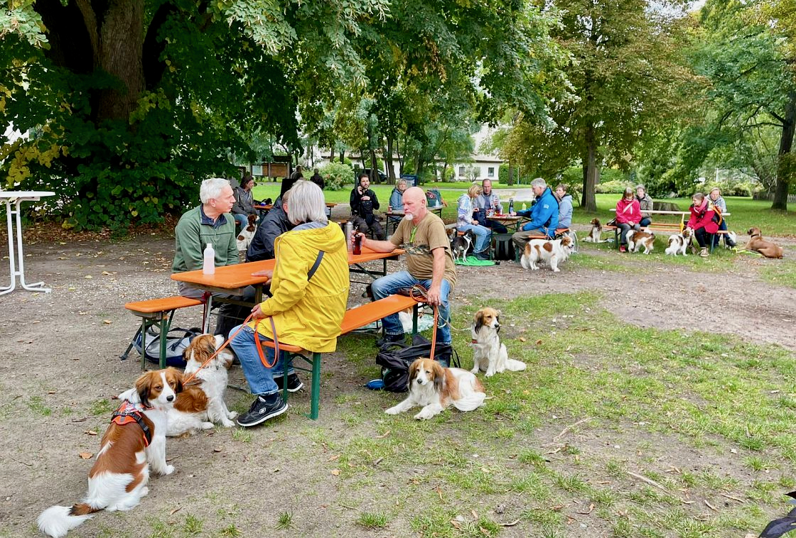 Am folgenden Tag stand der große Kooikerspaziergang auf dem Programm. Dazu waren weitere Teilnehmer als Tagesgäste angereist, so dass insgesamt ca. 50 Kooikerhondjes mit ihren Besitzern die rund 13 Kilometer lange Wanderung in Angriff nahmen. Zunächst führte der naturbelassene Weg zum benachbarten Campingplatz C16 in Boek, danach zu einem Aussichtspunkt mit Blick auf die Müritz. Weiter ging es am Rande der Kernzone des Müritz-Nationalparks entlang durch unberührte Natur bis nach Boek. Dort war für die Teilnehmer ein leckeres Kesselgulasch im Kutschercafè vorbereitet. Auch die angebotenen Torten fanden viele Abnehmer. Damit waren alle für den Rückweg zum Campingplatz am Bolter Ufer gerüstet.