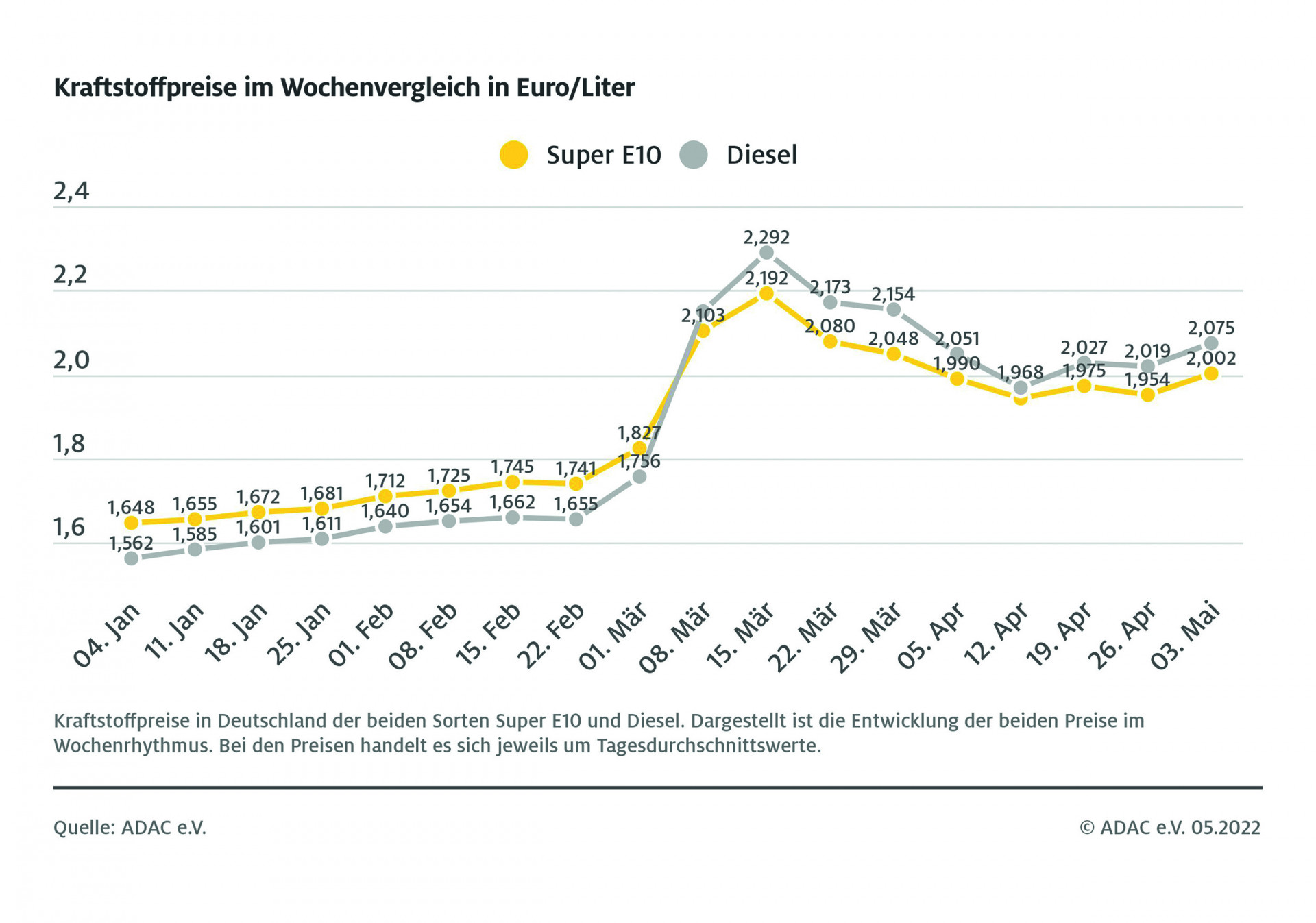 Die Fahrt zur Tankstelle ist binnen einer Woche wieder deutlich teurer geworden. Der Preis für einen Liter Super E10 ist im Vergleich zur Vorwoche um 4,8 Cent gestiegen und liegt aktuell im bundesweiten Mittel bei 2,002 Euro. Dies zeigt die aktuelle ADAC Auswertung der Kraftstoffpreise in Deutschland. Seit Anfang April bis Anfang Mai hatte Super E10 stets weniger als zwei Euro je Liter gekostet. Noch stärker ist der Preis für Dieselkraftstoff gestiegen. Für einen Liter müssen die Autofahrer derzeit im Schnitt 2,075 Euro bezahlen – ein Anstieg von 5,6 Cent.