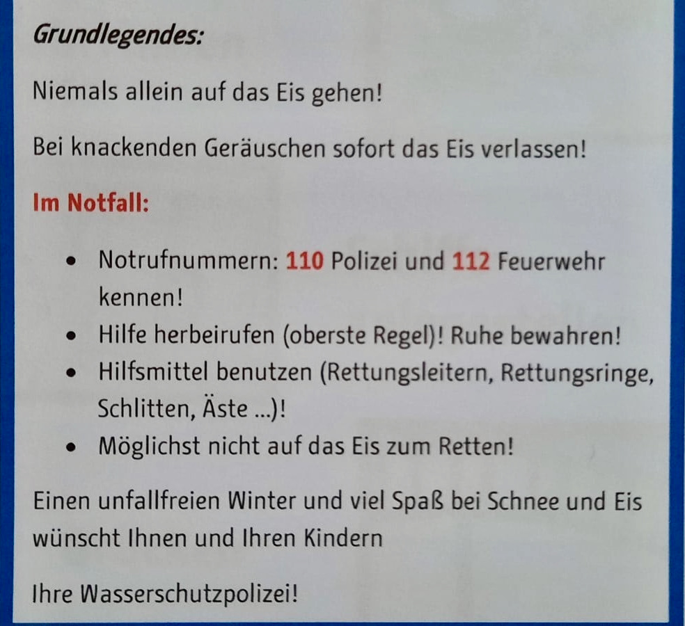 „Eis birgt viele Gefahren, nehmen Sie die Warnungen der örtlichen Behörden und Medien sehr ernst. Sprechen Sie gerade kurz vor dem Ferienbeginn mit Ihren Kindern über die Gefahren und darüber, wie man sich im Notfall verhält“, heißt es von den Beamten, die in den vergangenen Tagen schon vielerorts kleine und große Leute auf den Seen beobachtet haben.