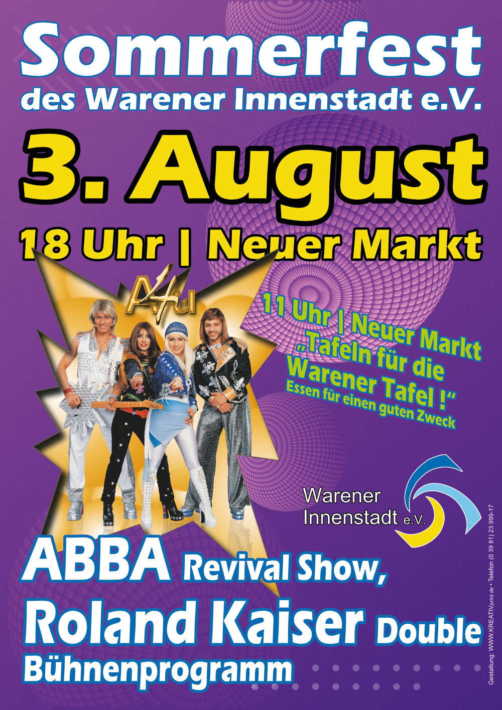 In diesem Jahr ist nach dem gemeinsamen Essen aber noch nicht Schluss: Der Innenstadtverein lädt ab 18 Uhr zum Sommerfest auf den Markt ein. Eine ABBA-Revival-Show und ein Roland-Kaiser-Double sollen an diesem Abend für ordentlich Party-Stimmung sorgen.