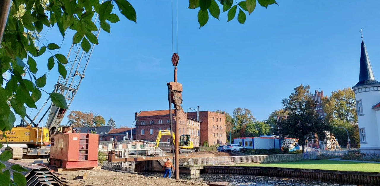 Dort wird gerade das Wehr des Oberbaches erneuert, das unterhalb der Brücke verläuft. Im Rahmen dieser Wasserbauarbeiten waren gerade schwere Kranarbeiten und erste Rammungen sowie Betonarbeiten nötig. Danach soll die neue Stahlkonstruktion für das Wehr installiert werden.