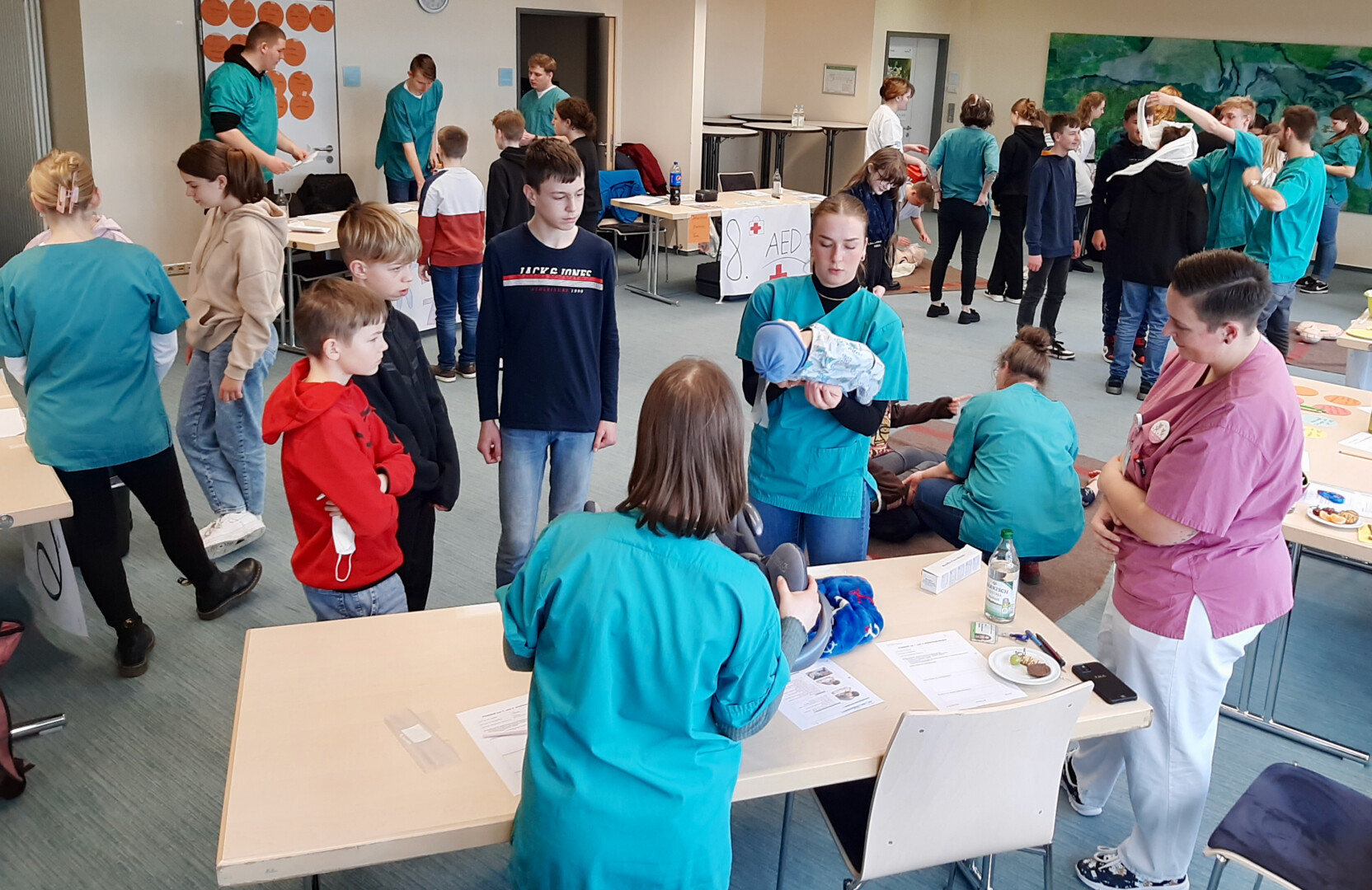 Für die Klassen im dritten Lehrjahr der Ausbildung zur Pflegefachfrau beziehungsweise zum Pflegefachmann ist im schulinternen Curriculum des RBB eine Anleitungssequenz zum Thema Erste Hilfe angesetzt. Vor kurzem bereiteten die Auszubildenden dafür Anleitungsstände zu verschiedenen Bereichen der Ersten Hilfe im Müritz-Klinikum vor und konnten dann ihr Wissen an die Mädchen und Jungen der siebten Klassen weitergeben.