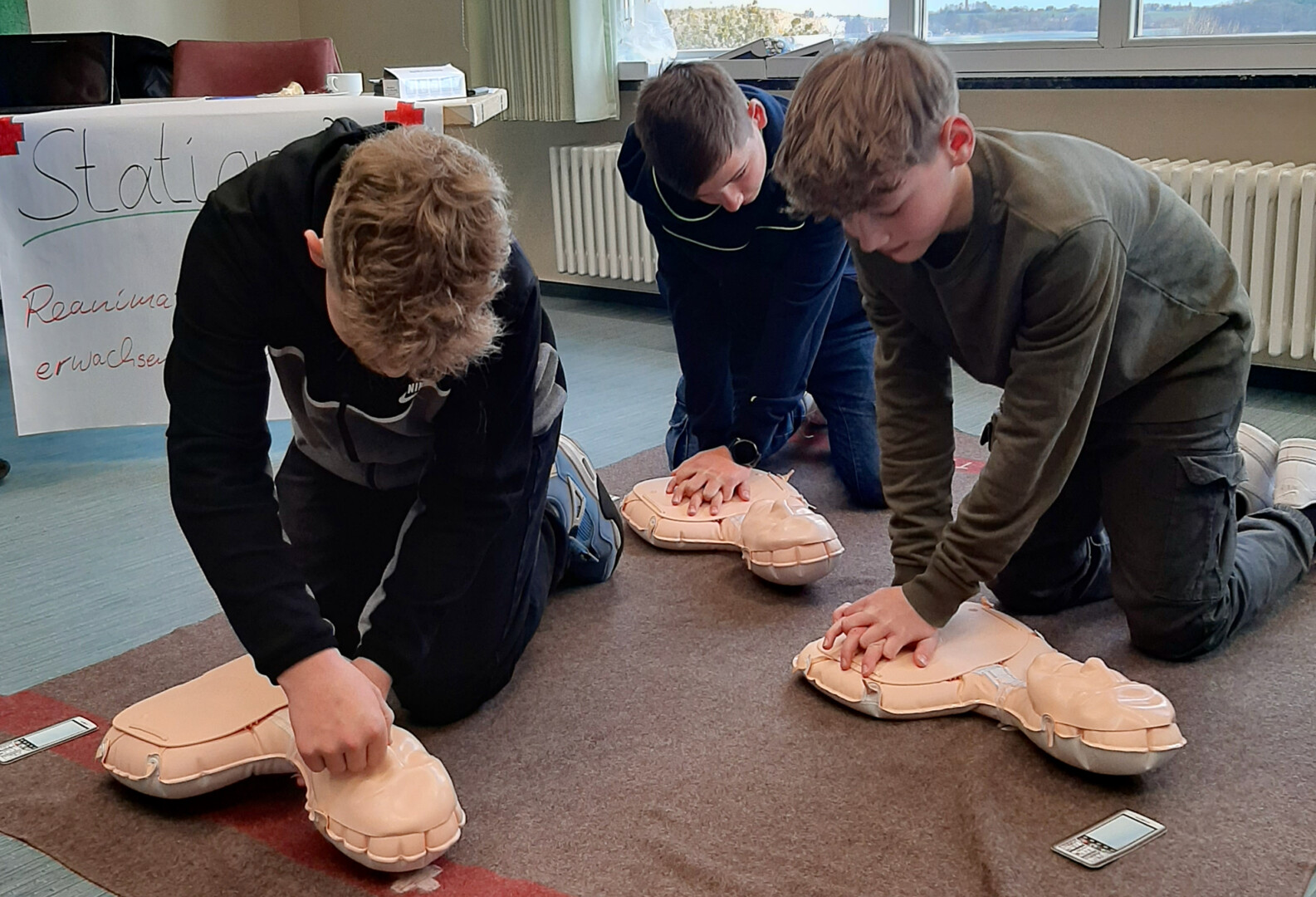 Die Schüler übten unter Anleitung der Auszubildenden die Herz-Lungen-Wiederbelebung und die stabile Seitenlage. Die stabile Seitenlage nutzt man zum Beispiel, wenn eine Person bewusstlos ist, aber selbstständig atmet. So wird verhindert, dass Blut oder Erbrochenes in die Atemwege gelangen können.