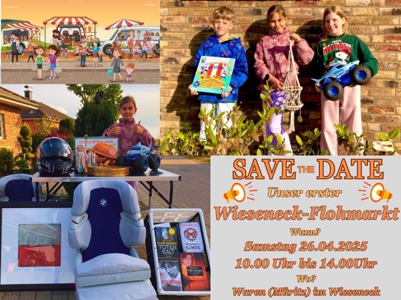 Bummeln, stöbern, feilschen, Leute treffen, Kuchen essen und Kaffee trinken: Zum ersten Mal laden die Bewohner des kuscheligen Warener Eigenheimgebietes „Wieseneck“ (ehemals Cassens) zu einem bunten Flohmarkt ein. Der startet am morgigen Sonnabend, 26. April, um 10 Uhr. Parkplätze gibt es am Spielplatz am Wiesengrund und in der Isenbahnstraat.