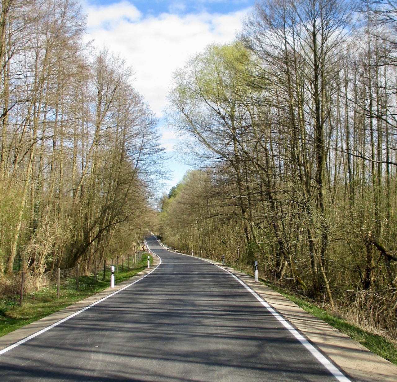 Zum Foto: Straßenfreigabe in Zeiten der Corona-Krise – Ohne Gäste und Probefahrt. Am 9. April hat das Bauamt des Landkreises den ersten Teilabschnitt der sanierten Kreisstraße bis zum Bärenwald für den Verkehr freigegeben.