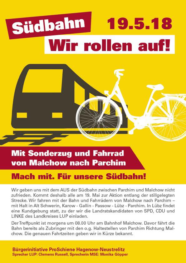 Sie geben nicht auf, die Kämpfer für die Südbahn. Am kommenden Sonnabend wollen sie wieder protestieren. Eigentlich sollte der Protestmarsch am 19. Mai auf den Gleisen stattfinden, doch das wurde nach Auskunft von Mit-Organisatorin Monika Göpper vom Verkehrsministerium des Landes – dieses Ministerium hat die Südbahn gekappt –untersagt.