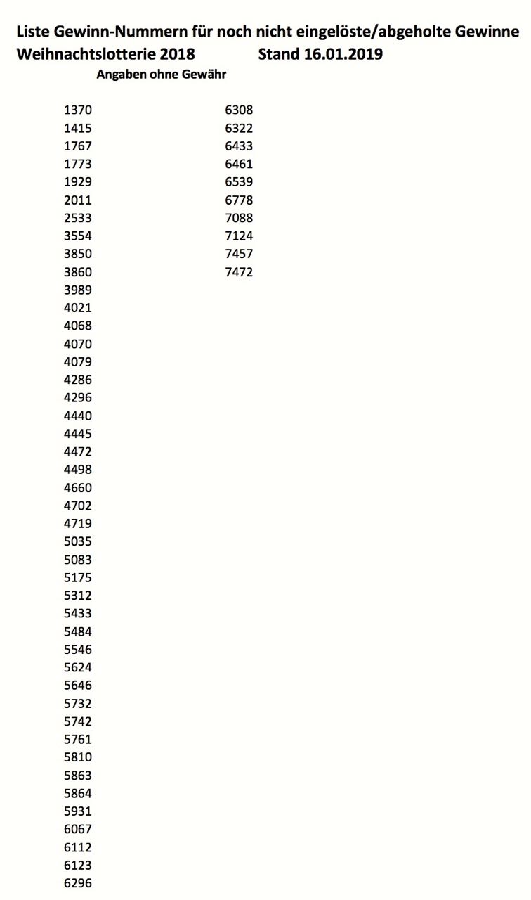 Also, liebe Kalender-Besitzer, kramt sie noch einmal hervor und vergleicht die Zahlen. Hier sind die Gewinn-Nummern, der noch nicht abgeholten Preise:
