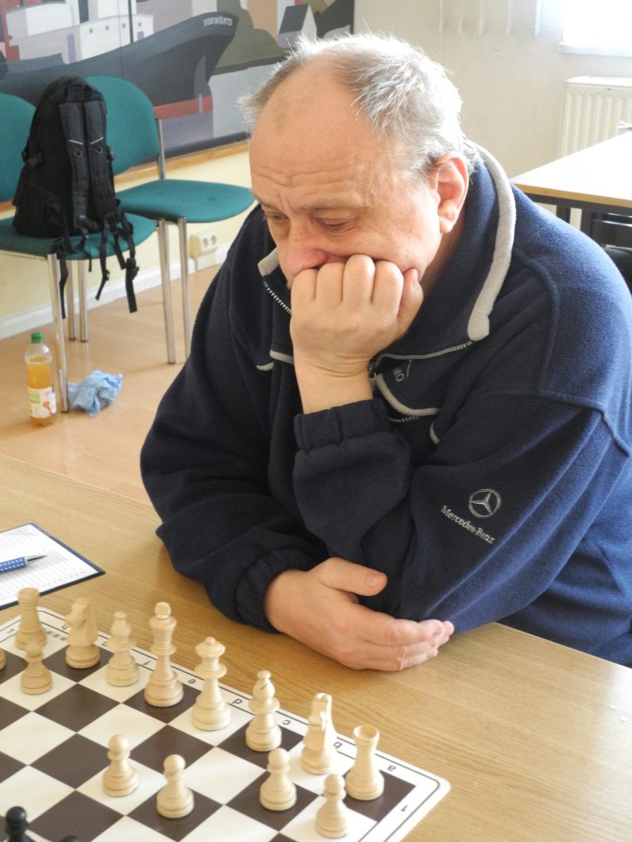 Auch die zweite Mannschaft musste mit unerwarteten Schwierigkeiten kämpfen. Das Team erreichte aber gegen die dritte Mannschaft des SSC Rostock immerhin ein 4:4 – Unentschieden und verteidigte damit den zweiten Tabellenplatz in der Bezirksliga Mitte. Egbert Benik (Foto) und Johannes Kruse (kampflos) gewannen, Wolfgang Schreiner, Lukas Kollark, Uwe Wendt und Richard Karberg spielten remis, Kevin Zwerg und Willi Karberg verloren ihre Partien.