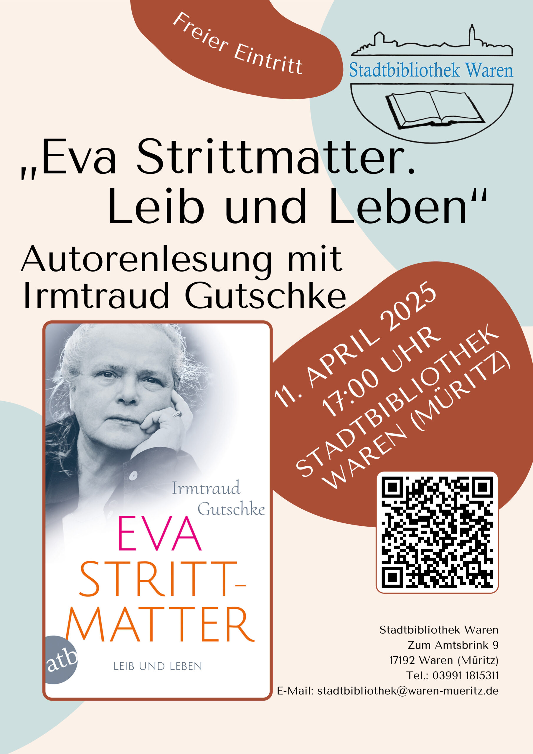 „Ich mach ein Lied aus Stille“ – Erinnerungen an Eva Strittmatter: Aus dem brandenburgischen Schulzenhof blickte sie in die Weite des Himmels und fragte das Gras zu ihren Füßen um Rat. Mit ihren Gedichten voller Lebensweisheit und Sehnsucht spricht Eva Strittmatter (1930 – 2011) auch nach ihrem Tode noch vielen Menschen aus dem Herzen, gibt ihnen Bestärkung für ihren Alltag. Die Stadtbibliothek Waren lädt am morgigen Freitag, 11. April, ab 17 Uhr alle Interessierten ein, der Autorin des Buches „Eva Strittmatter. Leib und Leben“, Dr. Irmtraud Gutschke, zu dieser beeindruckenden Lyrikerin der Gegenwart zu lauschen. Irmtraud Gutschke hat für ihr Buch ausführliche, intime Gespräche mit der Dichterin geführt und kann auf persönliche Weise über ihr Leben erzählen, das von Hunger nach Liebe ebenso bestimmt war, wie von ihrem Wunsch nach künstlerischer Selbstverwirklichung. Der Eintritt ist frei.