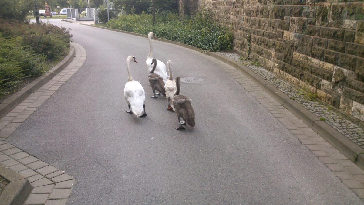 Immer nur auf dem See ist ja auch langweilig. Familie Schwan ist mal wieder auf Tour. Dieses Mal auf dem „schwarzen Weg“ in Richtung Brauhaus.