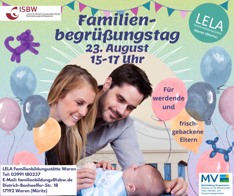 Familienbegrüßungstag heißt es am kommenden Dienstag, 23. August von 15 bis 17 Uhr bei der LELA Familienbildungsstätte des ISBW in Waren. Herzlich willkommen sind in der Dietrich-Bonhoeffer-Straße 18 sowohl werdende als auch frisch gebackene Eltern.