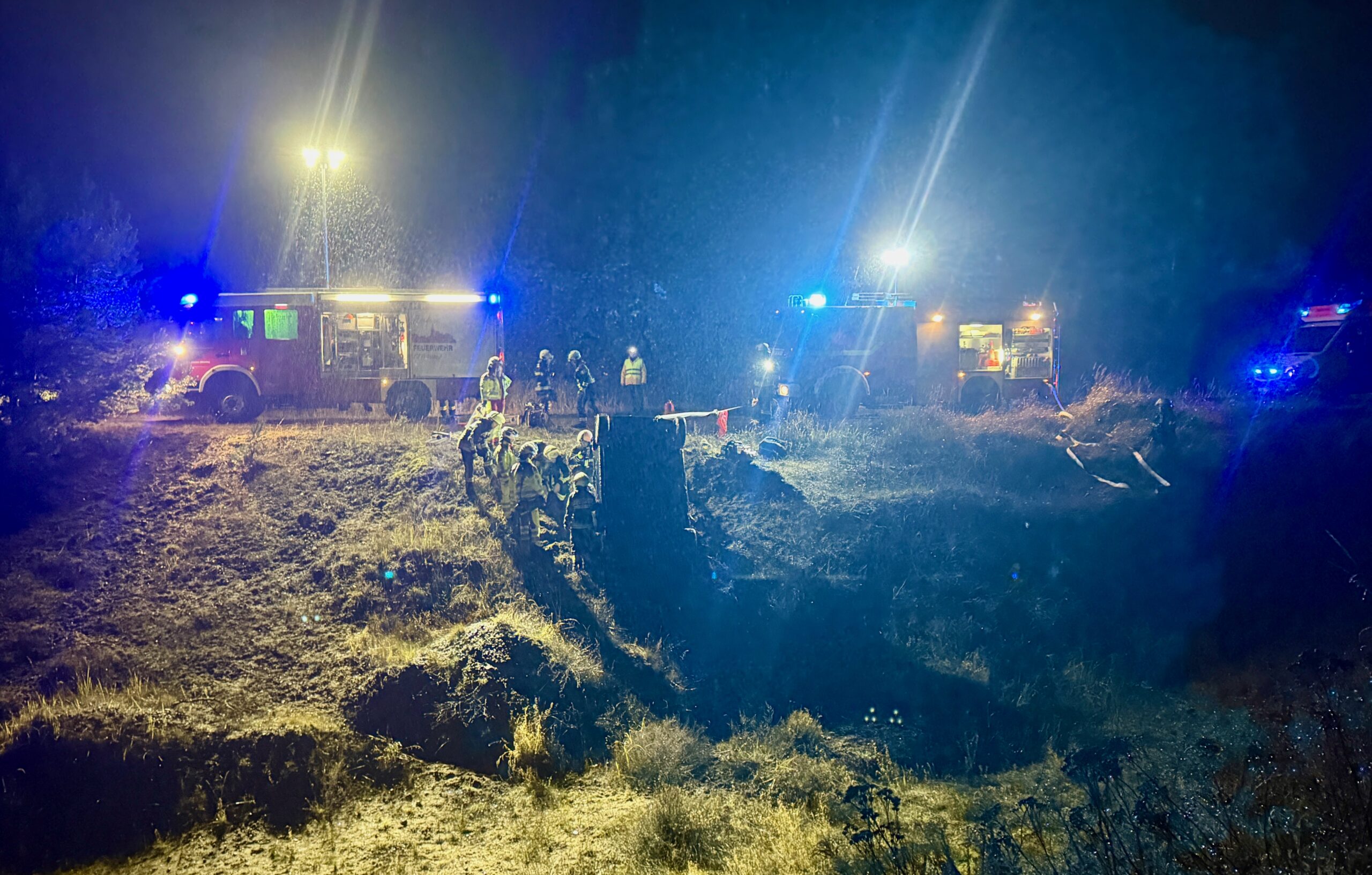 Von der Übung in der Kiesgrube, die vom Warener Stadtbauhof genutzt wird, wussten nur zwei, drei Leute in der Warener Feuerwehr. Für alle anderen war es eine Alarmierung, die Eile gebot: Unfall mit mehreren, eingeklemmten Verletzten. Also ging es Volldampf in Richtung Ortsausgang Gievitzer Straße und dann in den Werder Wald. Und tatsächlich lag dort ein Auto am Hang auf dem Dach. Schnell sicherten die Kameraden das Fahrzeug, Notfallsanitäter versuchten, sich inzwischen schon um die verletzten Insassen zu kümmern. Das alles bei strömendem Regen und kaltem Wind.