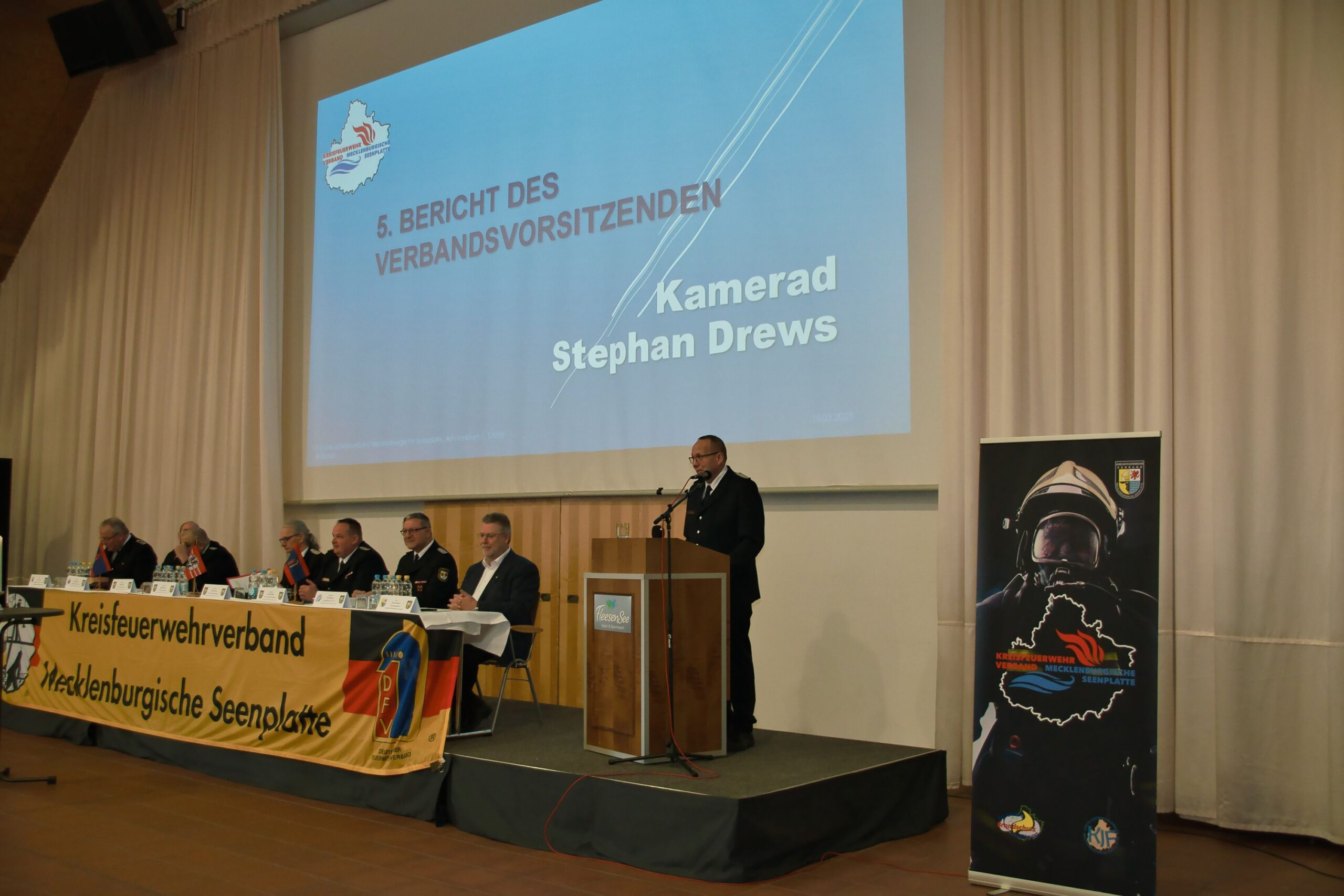 Der Vorstandsvorsitzende des Kreisfeuerwehrverbandes und Kreiswehrführer der Seenplatte, Stephan Drews, begrüßte zusammen mit seinen drei Stellvertretern nicht nur den Kreisjugendfeuerwehrwart Dominik Tramp, den Vizepräsidenten des Landesfeuerwehrverbandes M-V, Frank Bühring, den zweiten Stellvertreter des Landrates der Seenplatte, Thomas Müller, den Kreistagspräsidenten der Seenplatte, Thomas Diener, und seine angereisten Delegierten recht herzlich, sondern auch die zahlreichen Gäste, wie den Landesjugendfeuerwehrwart M-V, Christian Borchardt und seine Stellvertreterin Patricia Riemer, den Bürgermeister der Gemeinde Göhren-Lebbin, Thorsten Zillmer, dem Schlosshotel Fleesensee, sowie Vertreter aus der Feuerwehrtechnischen Zentrale Neuendorf, dem Ordnungsamt der Seenplatte, aus den Kreisfeuerwehrverbänden M-V und der Politik.