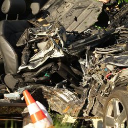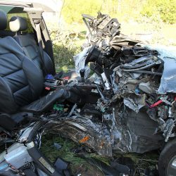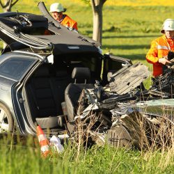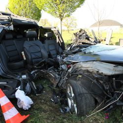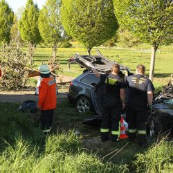 Während sich der Fahrer selbst aus dem völlig zerstörten Wrack befreien konnte, wurde der 35-jährige Bruder so schwer eingeklemmt, dass die Feuerwehr knapp 1 1/2 Stunden benötigte um ihn aus dem Wagen zu schneiden.