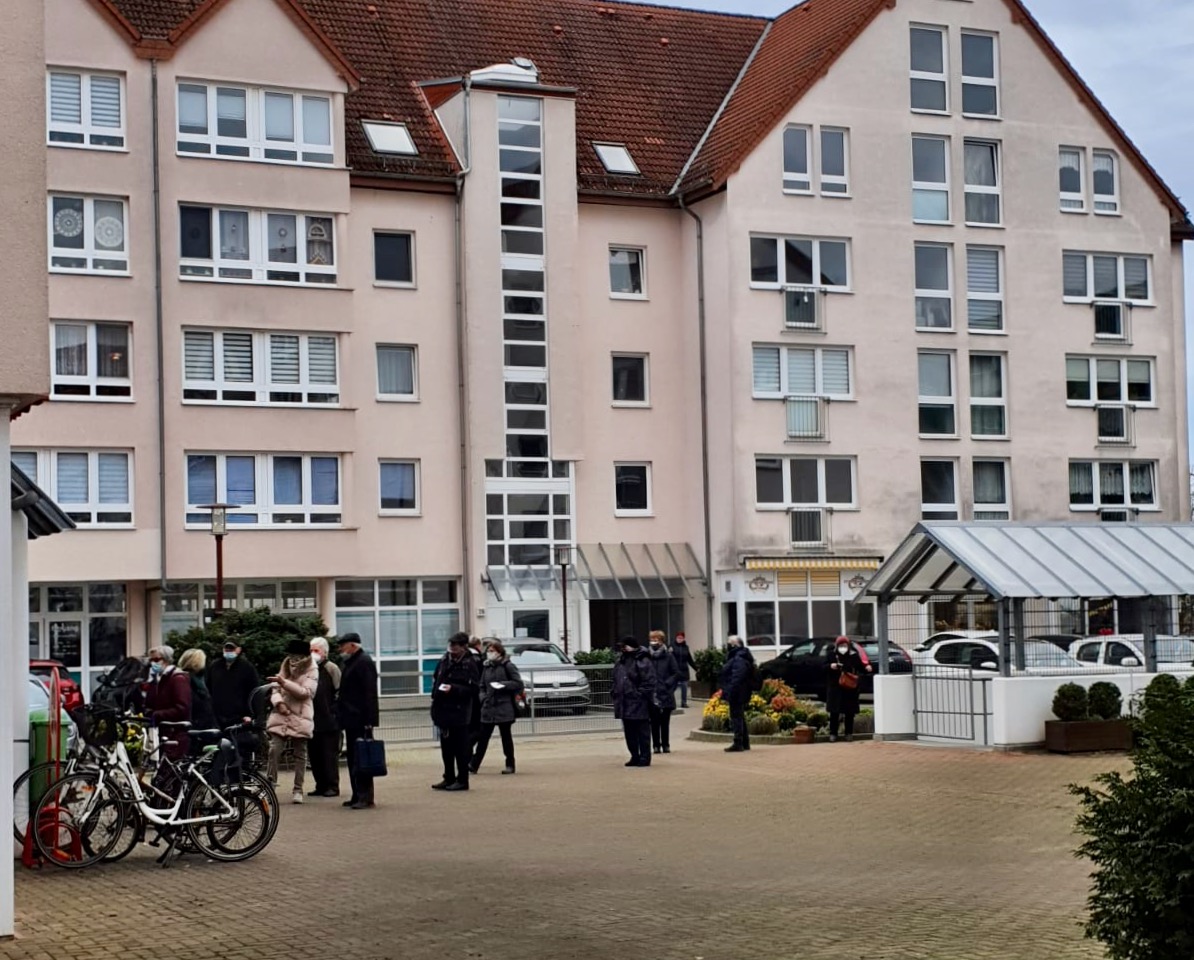Alle Bitten, doch nicht gleich loszustürmen, wenn die FFP2-Masken kostenlos verteilt werden, haben nichts genützt: Vor vielen Apotheken, wie hier auf dem Warener Papenberg, gab und gibt es heute lange Schlangen.