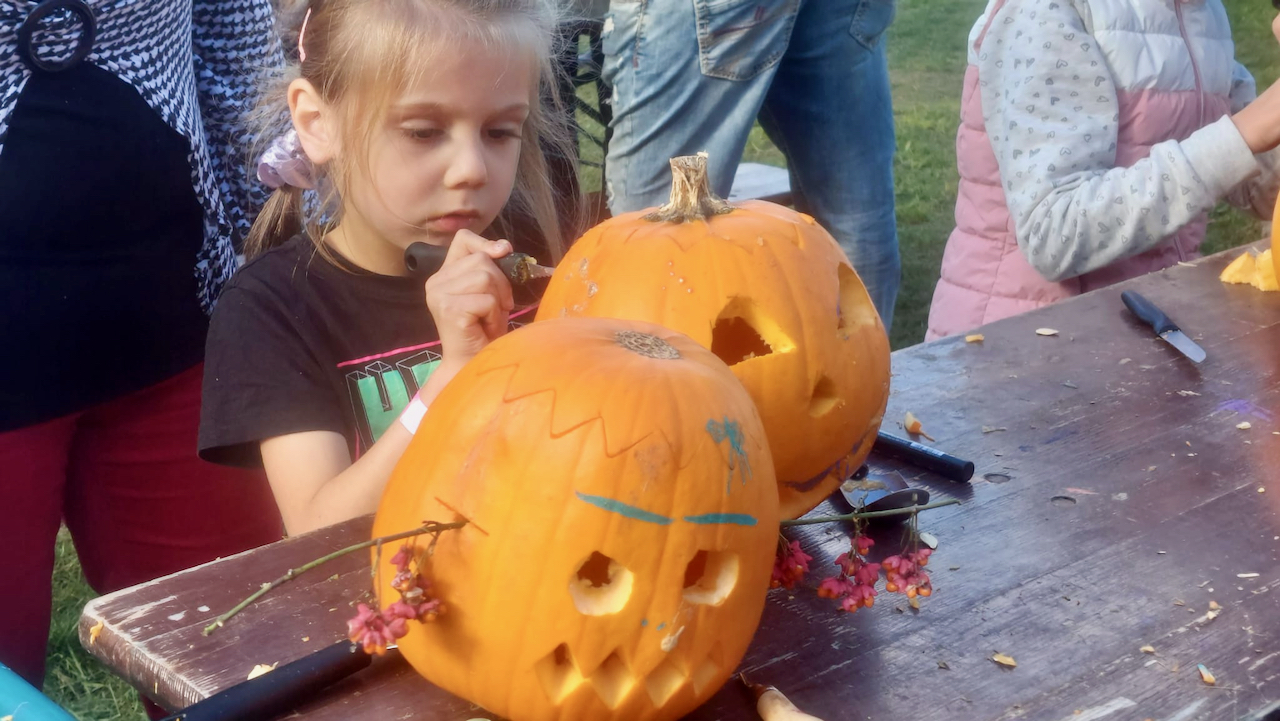 Viele Gäste im Agroneum genossen den heute Sonnenschein, besichtigten die Agrarmaschinen und probierten Kürbis-Kartoffelpuffer oder die zahlreichen Kürbis-Kreationen unter den Aufstrichen aus. Die Jüngsten schnitzten ihre Halloween-Exemplare mit großem Eifer, wie Lea.