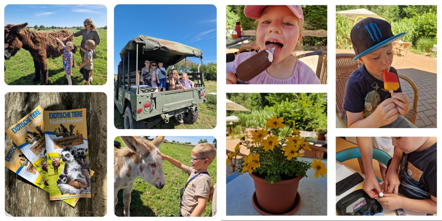 Ein besonderer Dank geht an Martin Warnke von der Tief- und Rohrleitungsbau Waren GmbH, der den Kindern einen unvergesslichen Ausflug in den Tiererlebnispark Müritz ermöglichte, inklusive einer privaten Safari-Tour. Die Freude war riesig. Danach ging es weiter zum Campingplatz Ecktannen, wo die Kinder ein köstliches Eis genießen durften, gesponsert von Platzleiter Jens Dörge. Der Tag endete mit ausgelassenem Toben am Strand – Sonnenstrahlen, Sand und Kinderlachen inklusive.