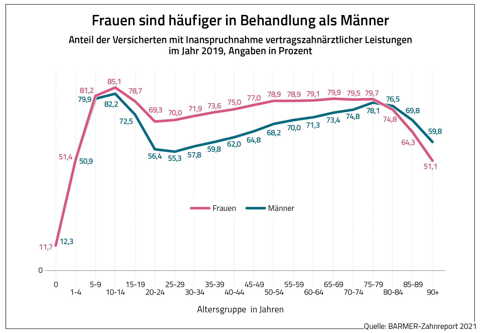 Typische Geschlechterunterschiede beginnen laut BARMER-Analyse ab dem Jugendalter. So gebe es noch unter den 15-Jährigen kaum eine Abweichung bei der Inanspruchnahme. Danach sinke sie bei Frauen wie Männern, bei Letzteren jedoch deutlich stärker. Erst ab etwa 80 Jahren nähere sie sich wieder an. „Gesunde Zähne sind ein wichtiger Aspekt hoher Lebensqualität. Deshalb möchten wir zur regelmäßigen Zahnvorsorge ermuntern“, so Straub. Die geringste Aufmerksamkeit schenkten junge Männer zwischen 25 und 39 Jahren ihrer Zahngesundheit. Sie nutzten zahnmedizinische Hilfe bis zu 14,7 Prozentpunkte weniger als gleichaltrige Frauen.