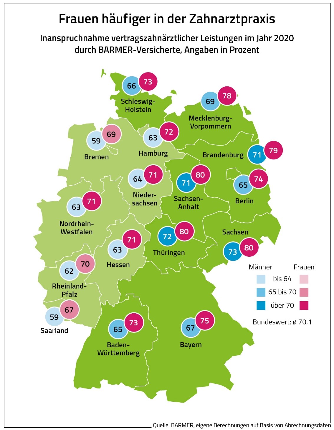 Frauen waren im Jahr 2020 deutlich häufiger in Zahnarztpraxen anzutreffen als Männer. Das zeigt eine aktuelle Auswertung von Abrechnungsdaten der BARMER. Im Jahr 2019 waren demnach 76,2 Prozent der Frauen, aber nur 67,8 Prozent der Männer in zahnärztlicher Behandlung. Im Jahr darauf traf dies auf 73,4 Prozent der Frauen und 65,3 Prozent der Männer zu. „Auch in Zeiten der Corona-Pandemie ist es so geblieben, dass Frauen häufiger Hilfe für ihre Zahngesundheit beanspruchen als Männer“, so Prof. Dr. Christoph Straub, Vorstandsvorsitzender der BARMER.