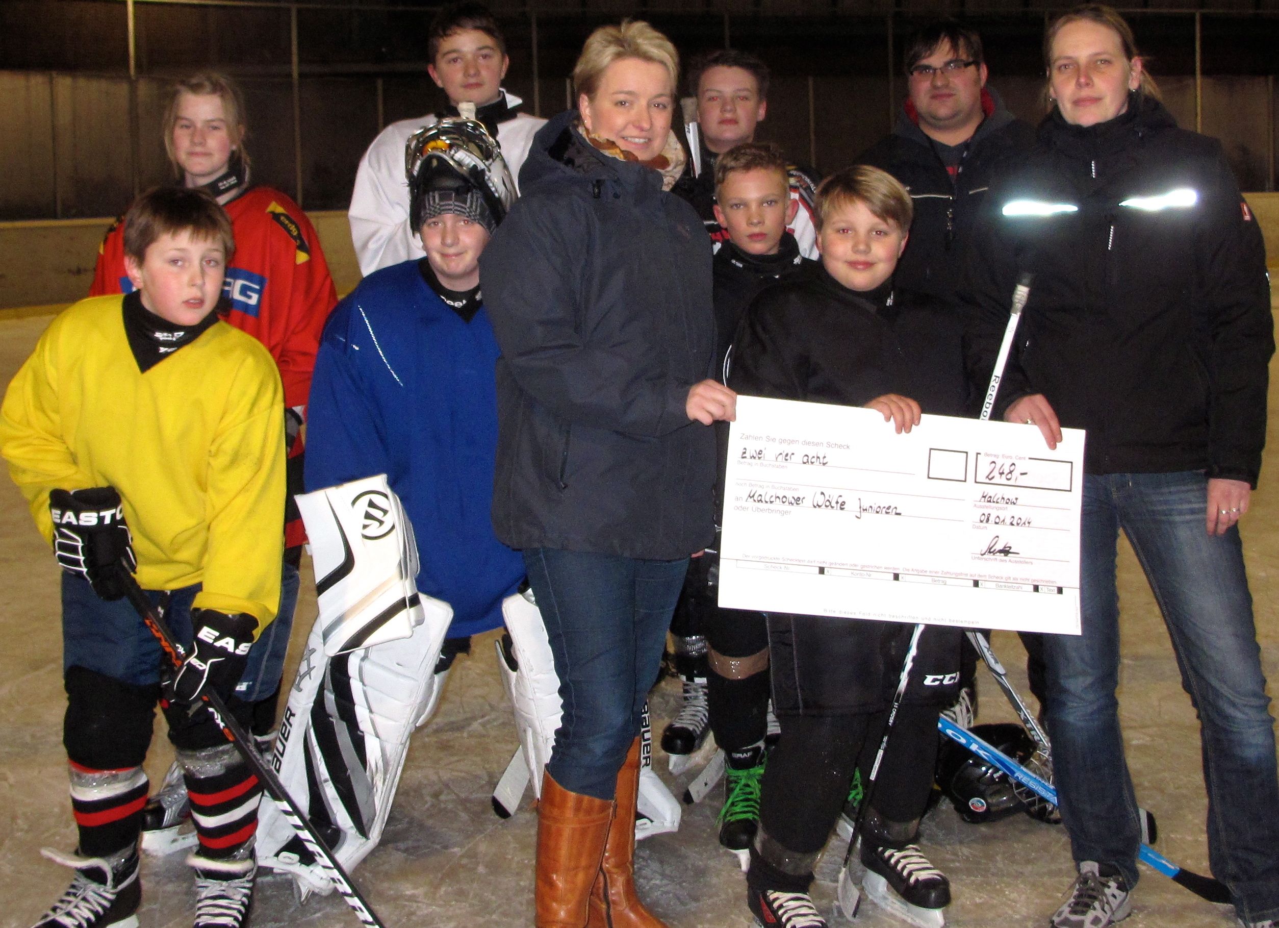 Die Junioren der Malchower Wölfe konnten sich jetzt über einen Scheck in Höhe von 248 Euro freuen. Das Geld ist Ende Dezember auf dem Familienfest in der Eishalle Malchow zusammengekommen.