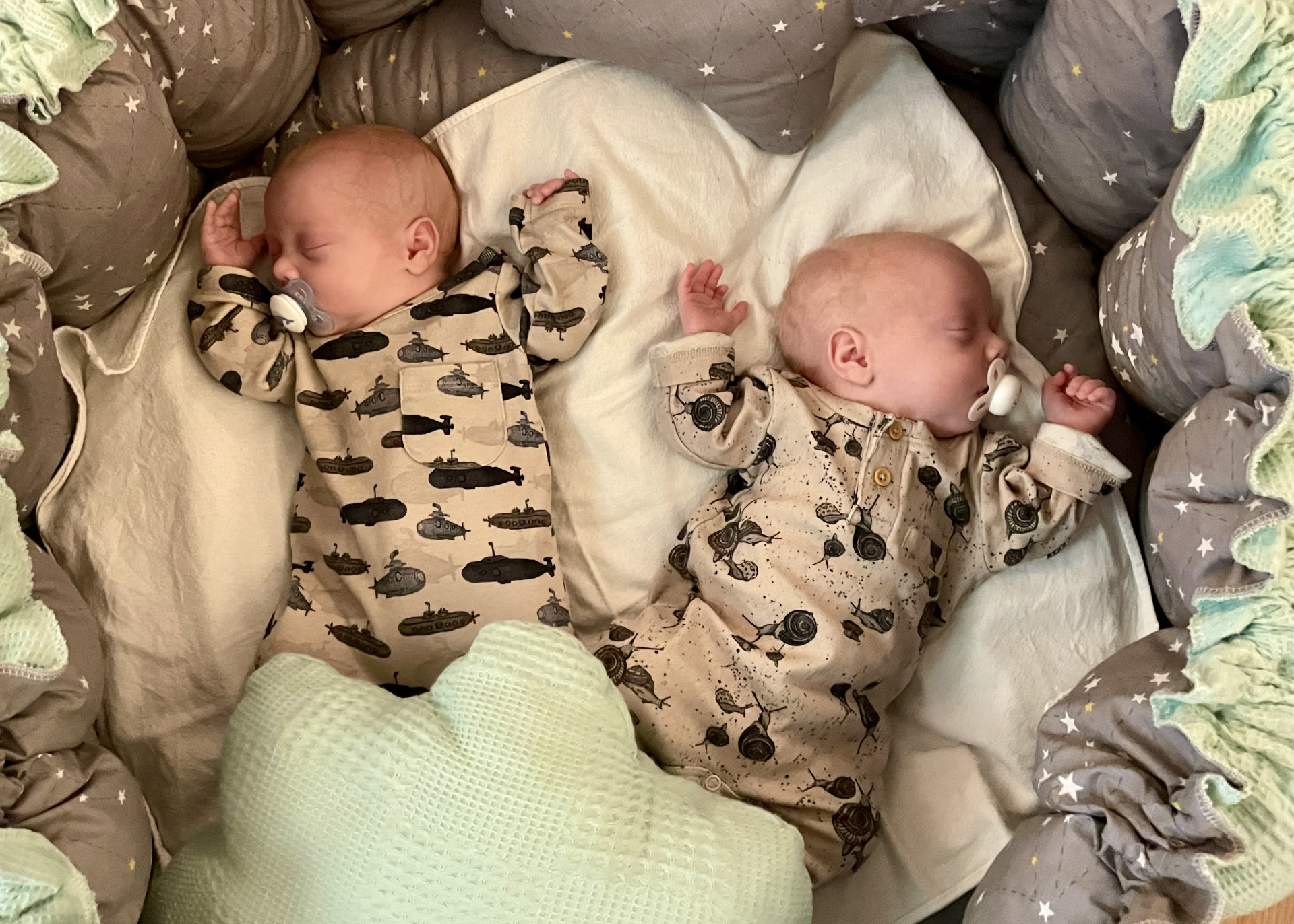 Von da an fuhr sie dann täglich nach Neubrandenburg, um für die Kinder möglichst lange da zu sein. Ich begleitete sie jeden zweiten Tag. Diese Phase war für uns unglaublich schön, da wir die schnelle Entwicklung unserer Söhne miterleben konnten. Jeder Tag brachte neue schöne Überraschungen mit sich. Relativ schnell waren die Kleinen die Magensonde und die Atemunterstützung los. Sie wanderten aus dem Inkubator in ein Wärmebett und wenige Tage später in ein normales Zwillingsbett. Wir konnten eine immer intensivere Zeit miteinander verbringen, konnten die Beiden füttern, stillen, wickeln und mit ihnen kuscheln.