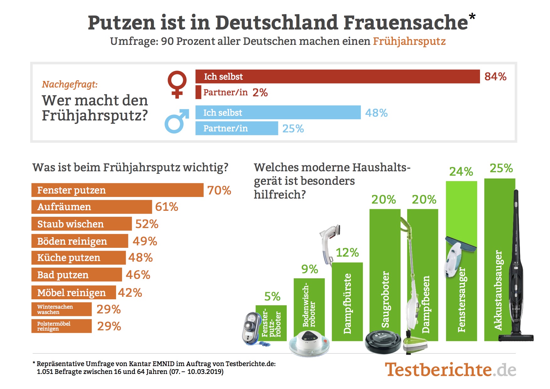 Informationen zur Studie: Für die repräsentative Umfrage hat Kantar EMNID im Auftrag von Testberichte.de vom 7. bis zum 10. März 2019 insgesamt 1.051 Personen im Alter zwischen 16 und 64 online nach ihren Einstellungen und Gewohnheiten zum Frühjahrsputz befragt.