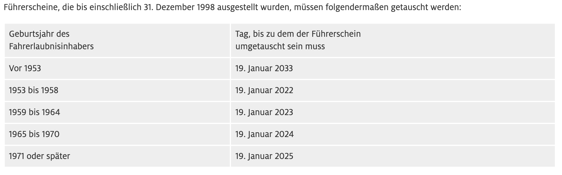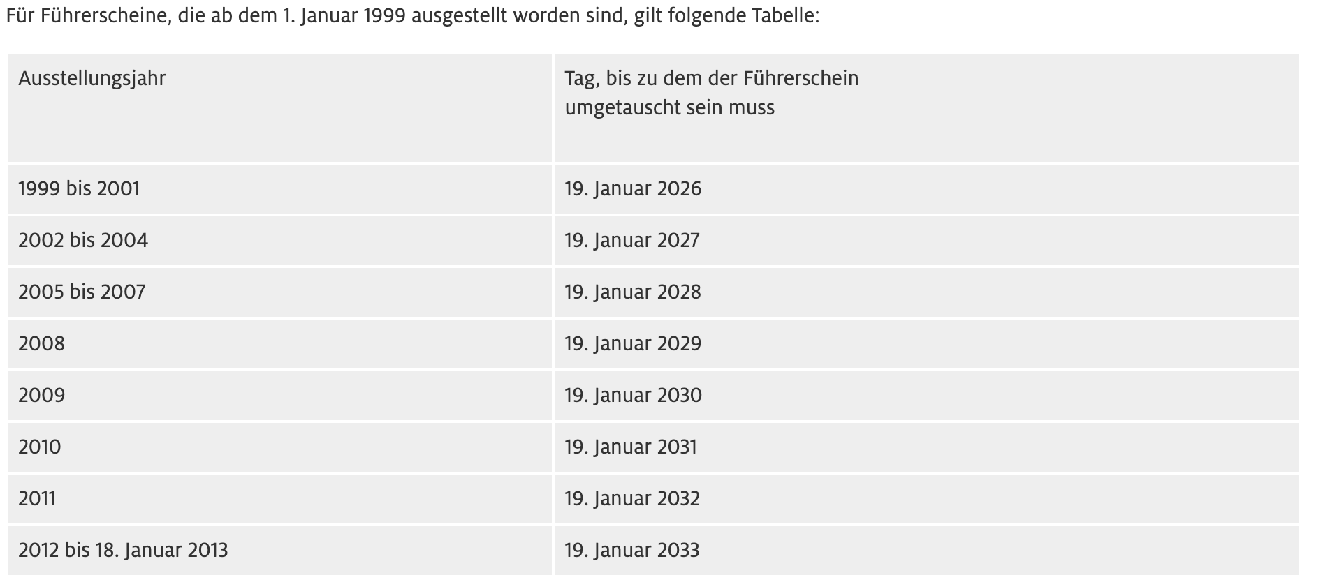 Der Umtausch ist verpflichtend, eine erneute Fahrprüfung oder Gesundheitsuntersuchung ist aber nicht notwendig. Um eine geordnete Abwicklung sicherzustellen und zur Vermeidung von Wartezeiten, erfolgt der Tausch ab dem 19. Januar 2022. in einem Stufenplan. Ausschlaggebend ist das Ausstellungsdatum und nicht das Erteilungsdatum des Dokuments. Je nachdem sind die Fristen entweder vom Geburtsjahr des Fahrerlaubnisinhabers oder vom Ausstellungsjahr abhängig.