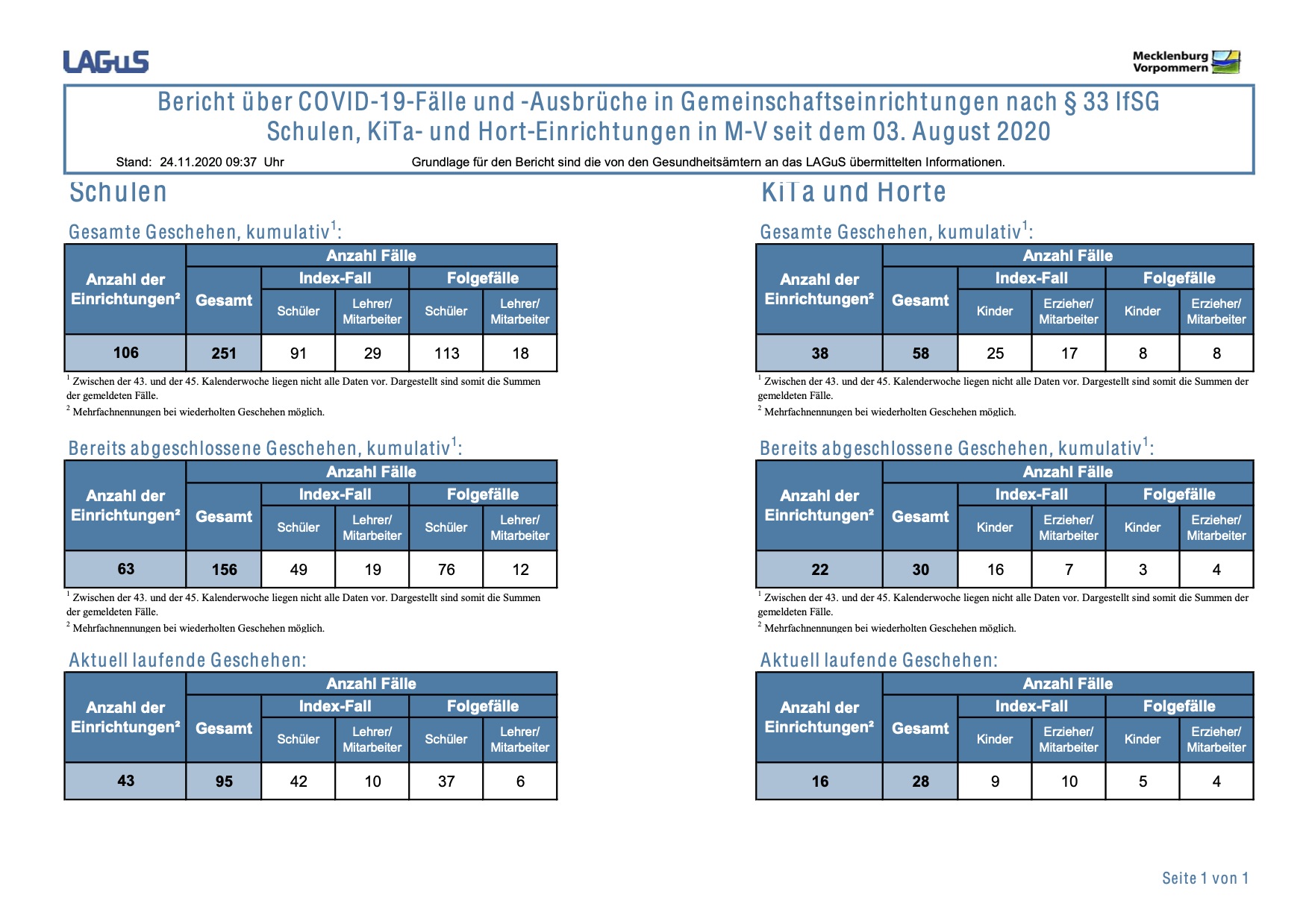 39 Schulen im Land sind derzeit von Quarantäne-Maßnahmen infolge eines Infektionsgeschehens betroffen. Davon sind vier Schulen derzeit vorübergehend geschlossen. Es handelt sich um die Fritz-Reuter-Grundschule in Güstrow, die Grundschule „Adolf Diesterweg“ in Parchim, die Grundschule Lübow und die Grundschule „Fritz Reuter“ in Grevesmühlen.