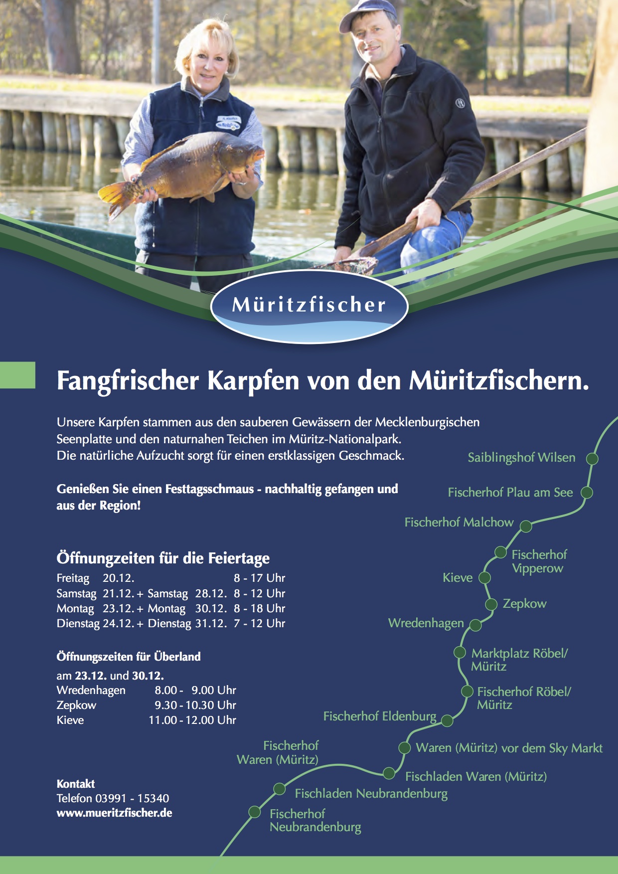 „Unsere Karpfen stammen aus den klaren Seen der Mecklenburgischen Seenplatte und der Teichwirtschaft im Müritz-Nationalpark. Dort wachsen sie drei bis vier Jahre heran und ernähren sich von der Naturnahrung im Teich und von Getreide aus der Gegend. Sie sind somit ein Musterbeispiel für regional und im Einklang mit der Umwelt erzeugten Fisch“, erklärte Sebastian Paetsch von den Müritzfischern.