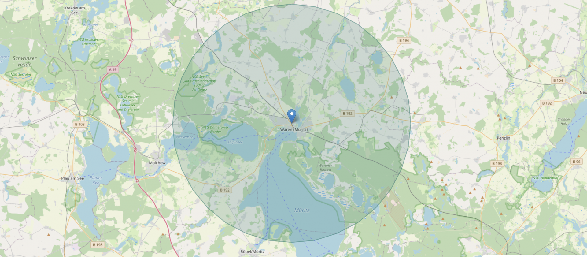 2. aus den vorgeschlagenen Suchergebnissen den gewünschten Ort auswählen und Enter drücken – der 15-km-Radius erscheint.