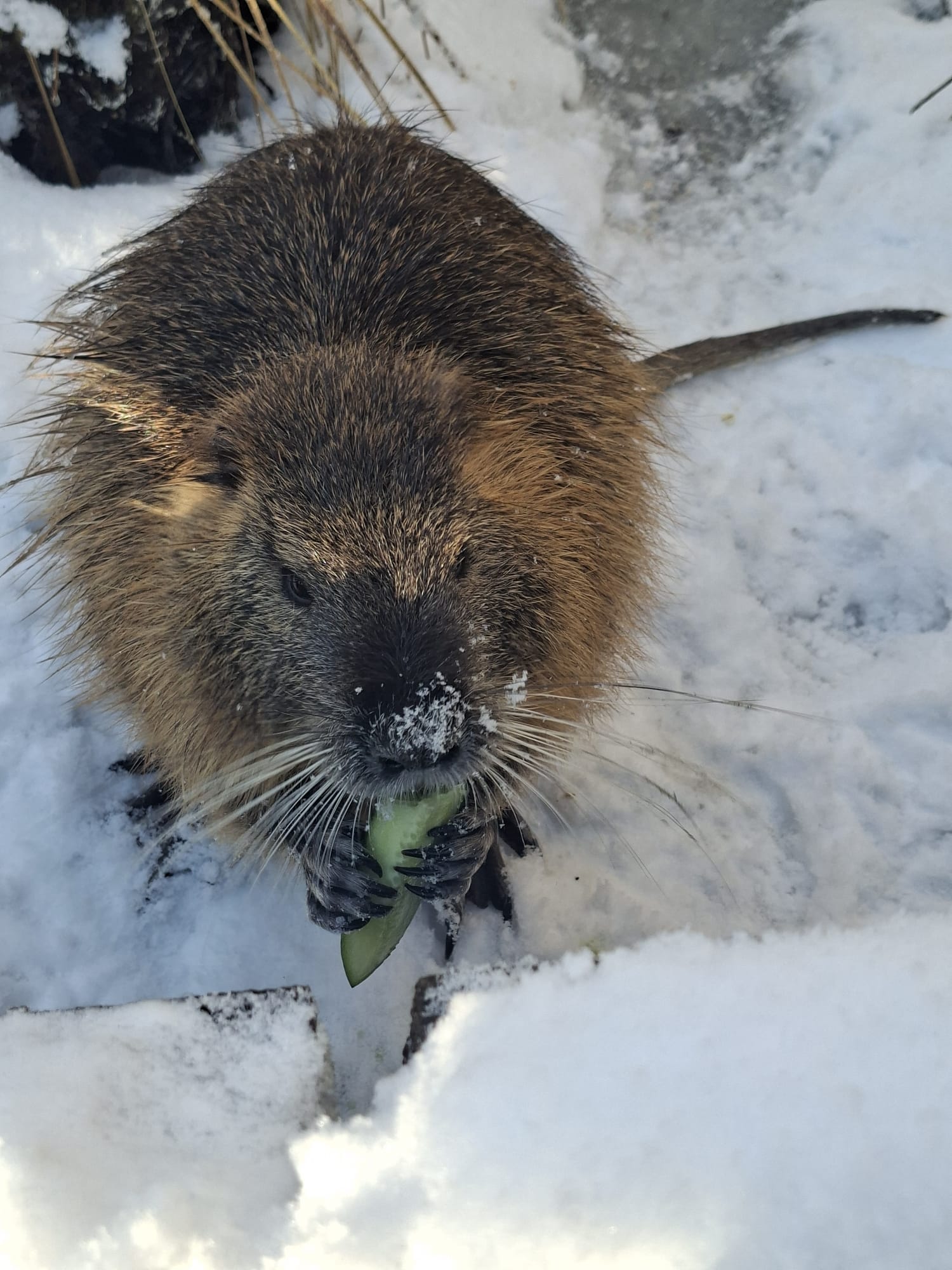 Wir sind noch nicht fertig mit dem heutigen Wintertag. Denn nicht nur „Norbert“ begeistert gerade viele Spaziergänger. An der Kameruner Brücke ist ein Nutria der Star, man nennt ihn liebevoll „Dickerchen“. Für ihn gab’s heute Sonntagsessen, und zwar eine leckere Gurke.