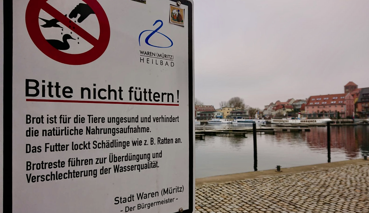 In ganz weiter Ferne scheint ein Fütter-Verbot aber auch an der Müritz nicht mehr zu liegen, wenn man die Schilder am Warener Stadthafen sieht. Dort wird bereits empfohlen, auf die zusätzliche Fütterung von Wasservögeln zu verzichten. Die Nährstoffe, die ins Wasser fallen, belasteten die heimischen Gewässer. Und Ratten finden die Reste auch ganz lecker.