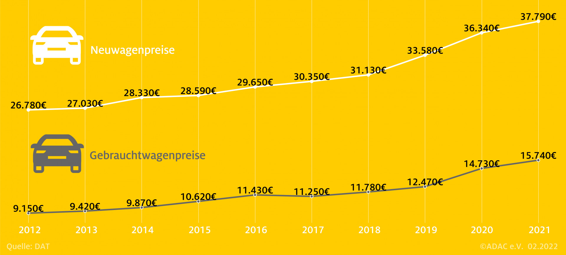 Der Hauptgrund für die hohen Preise sind Lieferengpässe bei Neuwagen. Produktionsausfälle durch die Corona-Pandemie bzw. den Chipmangel haben den Neuwagenmarkt ausgedünnt. 2019 wurden noch 3,6 Mio. Neuwagen zugelassen, 2021 eine ganze Million (2,6 Mio.) weniger. Entsprechend weniger Fahrzeuge landeten auf dem Gebrauchtwagenmarkt. Laut DAT ändert sich dabei auch für das laufende Jahr nicht viel, das schmalere Angebot hält die Preise hoch. Und auch künftig werden Händler pandemiebedingte höhere Kosten und Ausfälle voraussichtlich mit höheren Verkaufspreisen kompensieren. So kann man die hohen Preise etwas abfedern:
