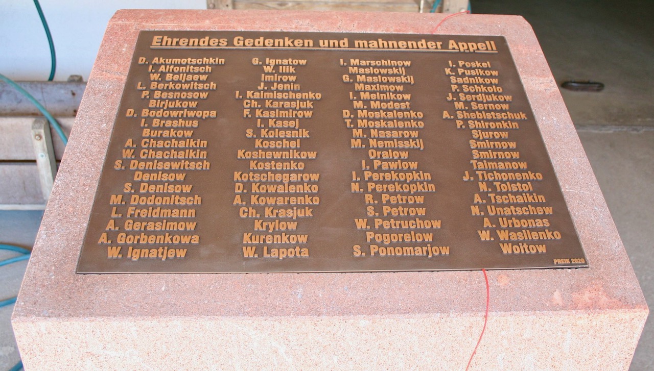 Enthüllt wird im Rahmen der Gedenkveranstaltung der neue Gedenkstein mit den nun deutlich lesbaren 76 bekannten Namen der dort zur Ruhe gebetteten sowjetischen Armeeangehörigen.