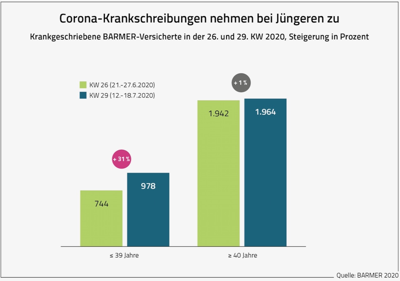 Insbesondere jüngere Menschen müssten sich wieder verstärkt an die Corona-Regeln halten, denn in der Gruppe ab 40 Jahren seien die Fallzahlen nahezu konstant geblieben. Diese seien im selben Zeitraum von 1.942 krankgeschriebenen Barmer-Versicherten um ein Prozent auf 1.964 Betroffene gestiegen.