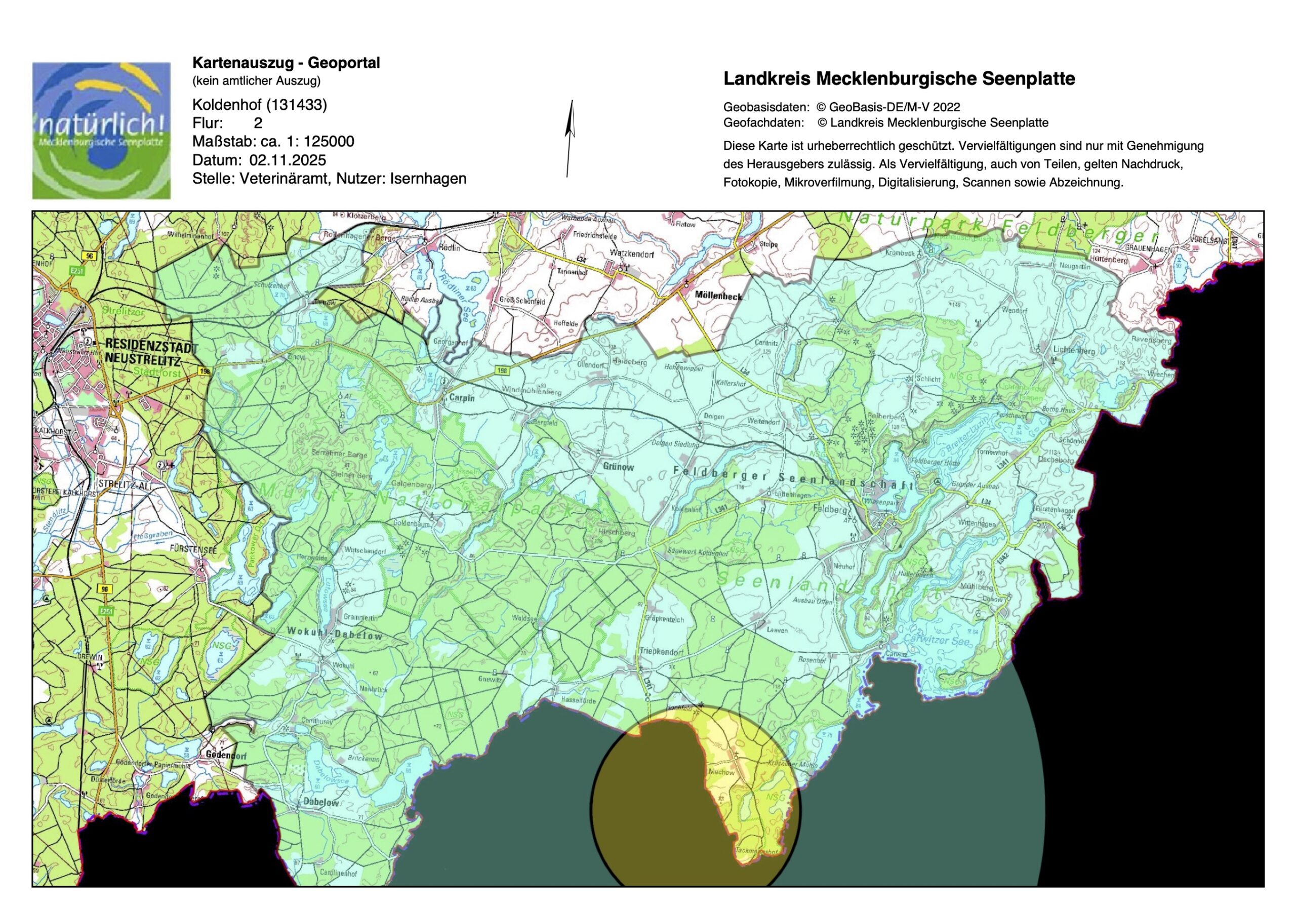 Die Geltungsbereiche der Schutz- und Überwachungszonen ist in der beigefügte Karte farblich dargestellt und ist wie die entsprechende Allgemeinverfügung auf der Internetseite des Landkreises Mecklenburgische Seeplatte über die Kachel „Tierseuchen“ abzurufen.