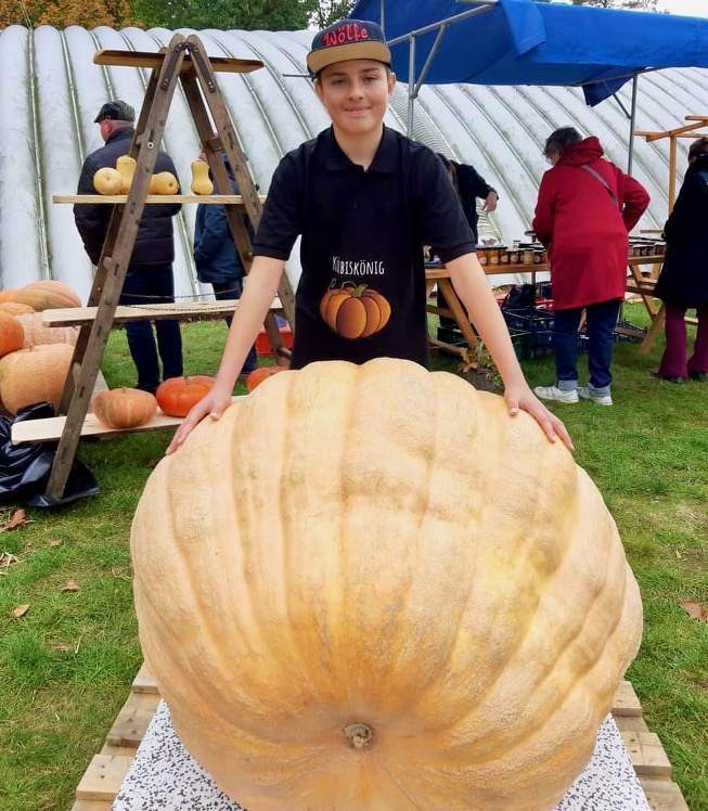 Titelverteidigung gelungen: Fiete aus Röbel und seine Familie haben heute erneut den schwersten Kürbis am Agroneum in Alt Schwerin präsentiert. Das dicke Ding brachte 250 Kilo auf die Waage und musste mit einem Radlader transportiert werden. Nicht der erste Sieg des heute Zwölfjährigen, er und seine Familie haben mit Kürbissen einer amerikanischen Sorte bereits einige Erfolge eingefahren. Im vergangenen Jahr interessierte sich sogar die US-Botschaft in Berlin für die Kürbisse des Röbelers (WsM berichtete).