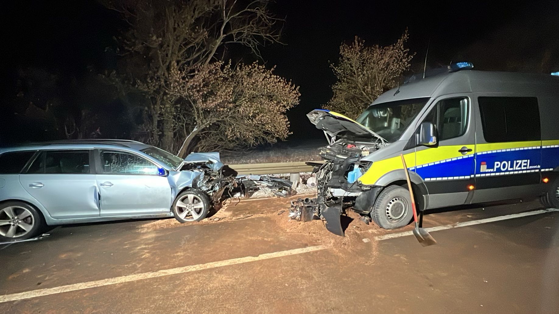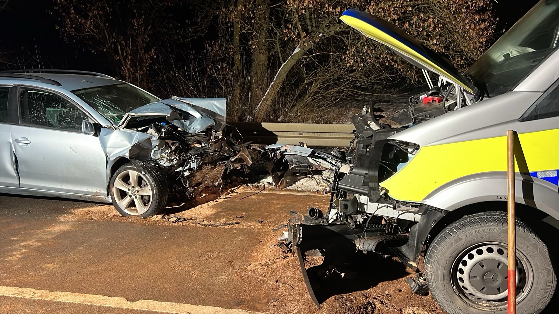 An beiden Fahrzeugen entstand wirtschaftlicher Totalschaden. Der Schaden am Dienstfahrzeug beläuft sich auf ca. 30.000 Euro und an dem VW auf ca. 5.000 Euro. Zur Bergung wurden Abschleppdienste beauftragt.