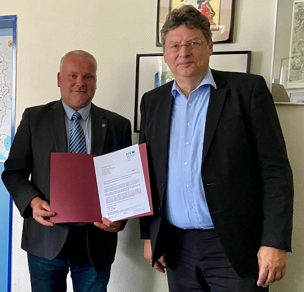 Ob Warens Bürgermeister Norbert Möller da ein bisschen neidisch war? In seinem Büro am Amtsbrink hat MV-Wirtschaftsminister Reinhard Meyer heute Mittag nämlich einen dicken Förderscheck überreicht. Allerdings nicht an Norbert Möller, sondern an den Bürgermeister der Gemeinde Grabowhöfe, Enrico Malow. Für ihn gab’s satte 387 000 Euro. Die Gemeinde will nämlich die Straße zwischen Grabowhöfe und Sommerstorf in Schuss bringen. Das kostet insgesamt 563 00 Euro, Enrico Malow konnte dem Land also sozusagen rund 70 Prozent der Kosten „aus dem Kreuz leiern“.