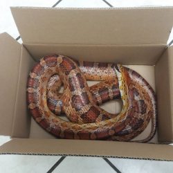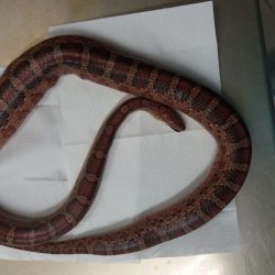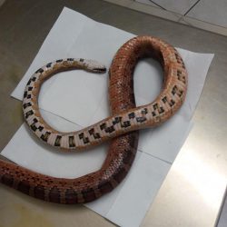 schlange1Am 2. Weihnachtstag wurde von Kindern diese ausgewachsene, wildfarbene, 1,35m lange Kornnatter auf dem Papenberg in Waren gefunden.