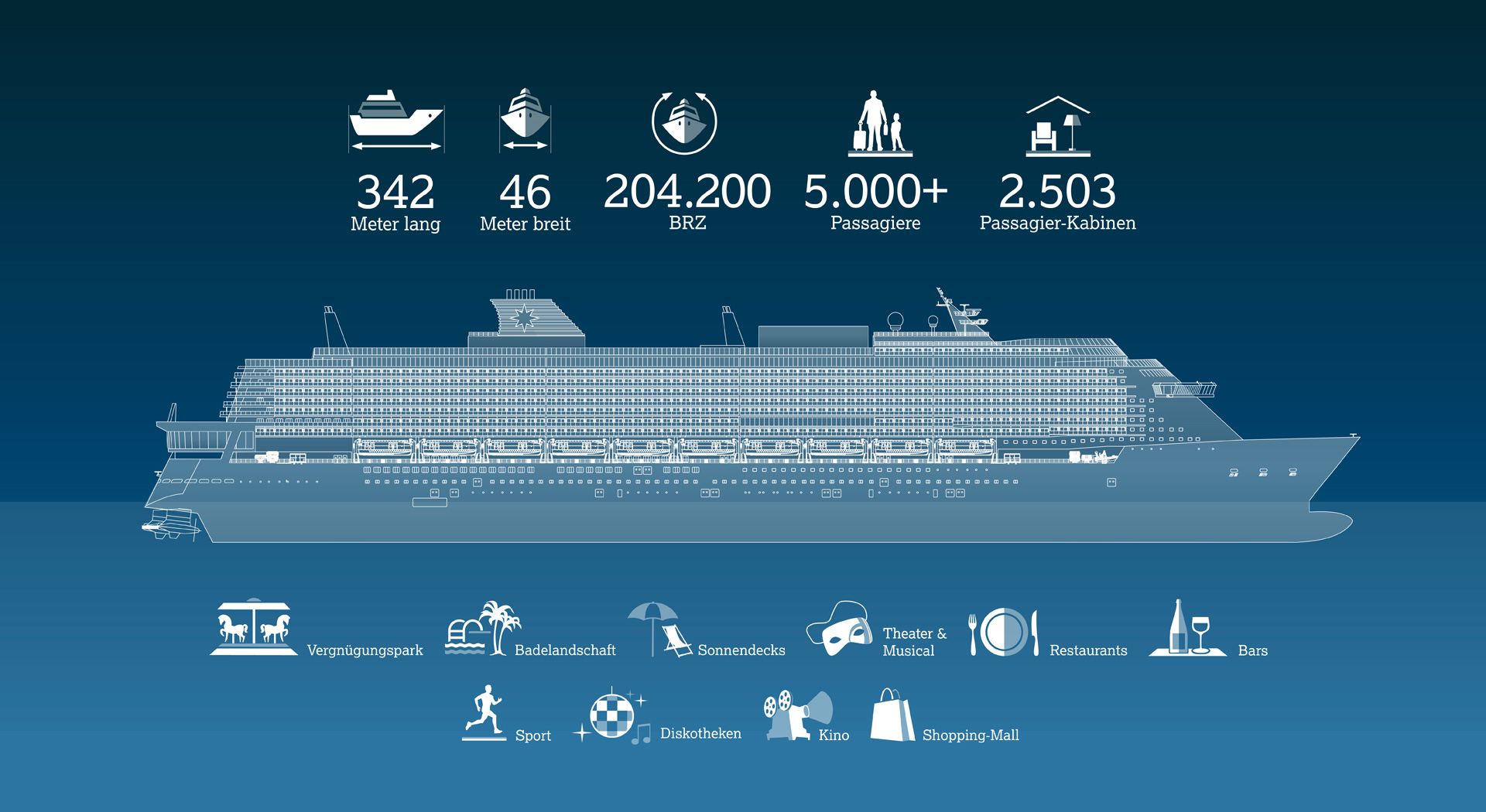 Die Kreuzfahrtschiffe werden 342 Meter lang und 46,40 Meter breit sein und einen Tiefgang von 9,50 Meter haben. Bei einer Größe von 204.000 BRZ bieten die Megaliner – bei Doppelbelegung – über 5.000 Passagieren in 2.500 Kabinen Platz. Die Kabinen sind speziell für asiatische Familien ausgelegt. Sie bieten Schlafplätze für zwei, drei oder vier Personen mit geteilten (zwei) Badezimmern und gestatten so einen größeren preislichen Spielraum für den asiatischen Markt.